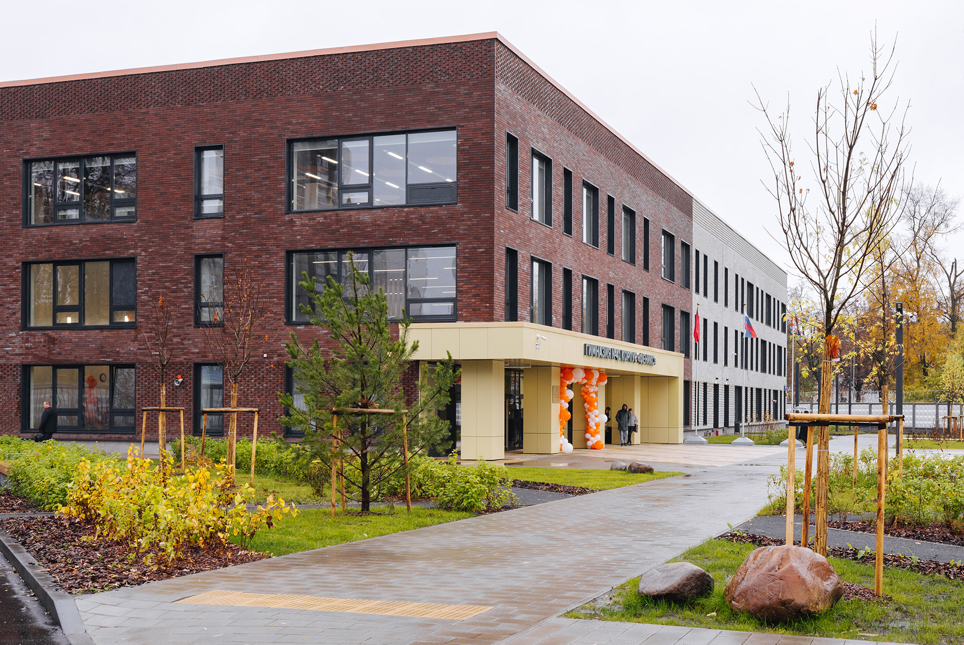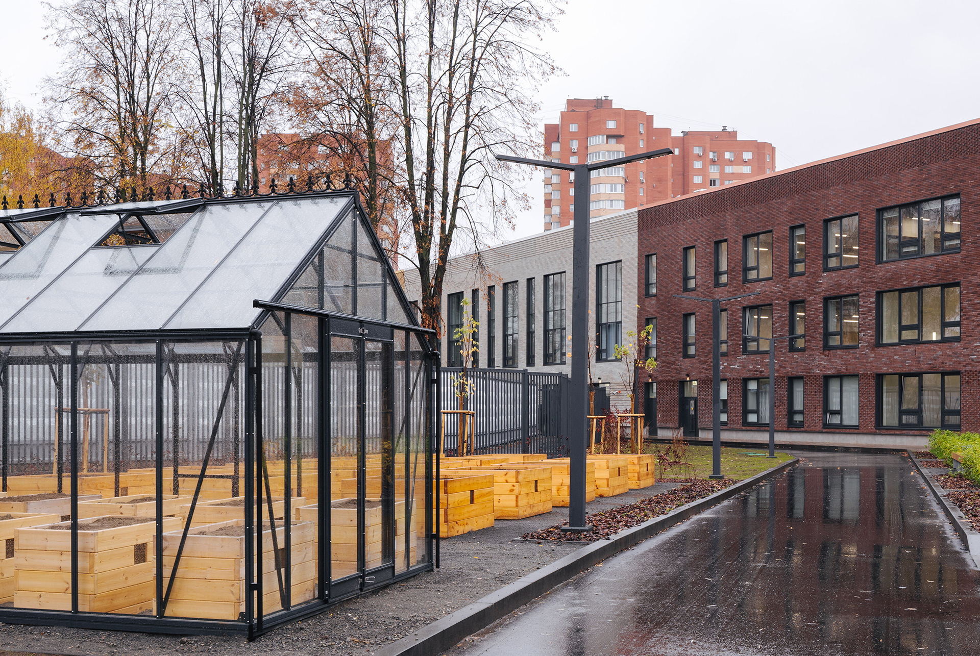 Вокруг школы создана безопасная среда с продуманным зонированием: мини-парк для прогулок, пространства для игр и занятий на открытом воздухе.