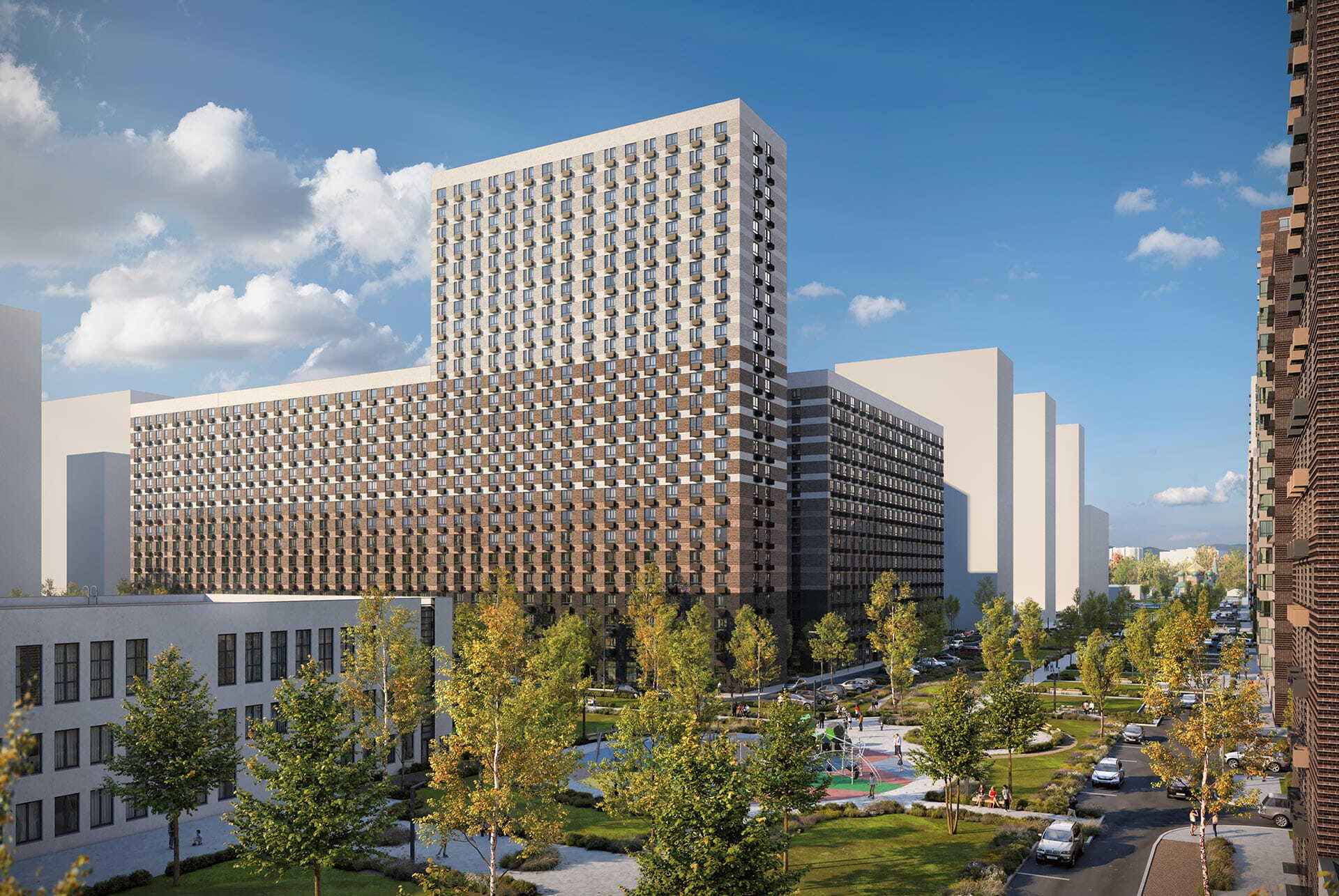 В домах просторные подъезды с высокими потолками, функциональным дизайном, надёжными лифтами и двумя входами: со двора и улицы. Входы расположены на уровне земли, без ступеней и пандусов — так комфортней и безопаснее для всех. На первых этажах разместятся магазины и предприятия сферы услуг. Во дворах без машин будут обустроены места для отдыха, детские и спортивные площадки.
