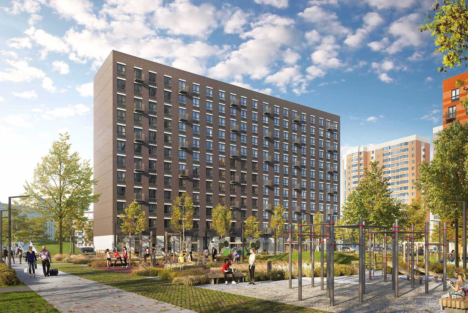 Корпус 15 — монолитное здание высотой 12 этажей. В доме светлые и просторные подъезды с высокими потолками, функциональным дизайном, видеонаблюдением, бесшумными скоростными лифтами и двумя входами: со двора и улицы. Входы в подъезды расположены на уровне земли, без ступеней и пандусов. На первом этаже разместятся магазины и предприятия сферы услуг. Во зелёном дворе появятся места для отдыха, детские и спортивные площадки. Молодёжь будет рада расположенному поблизости скейт-парку.
