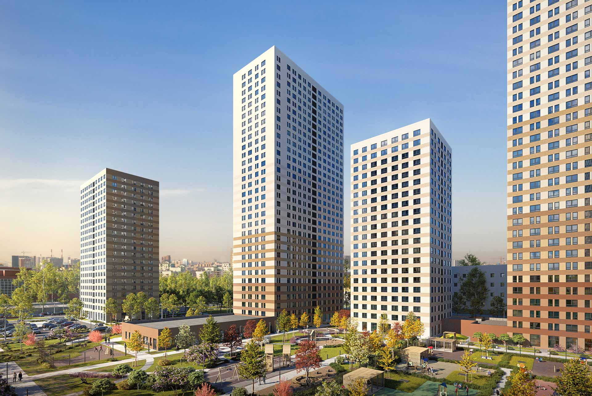 «Кронштадтский 9» включает семь корпусов высотой от 21 до 32 этажей. Для самых маленьких жителей мы построим два детских сада. Для владельцев автомобилей предусмотрен подземный паркинг.