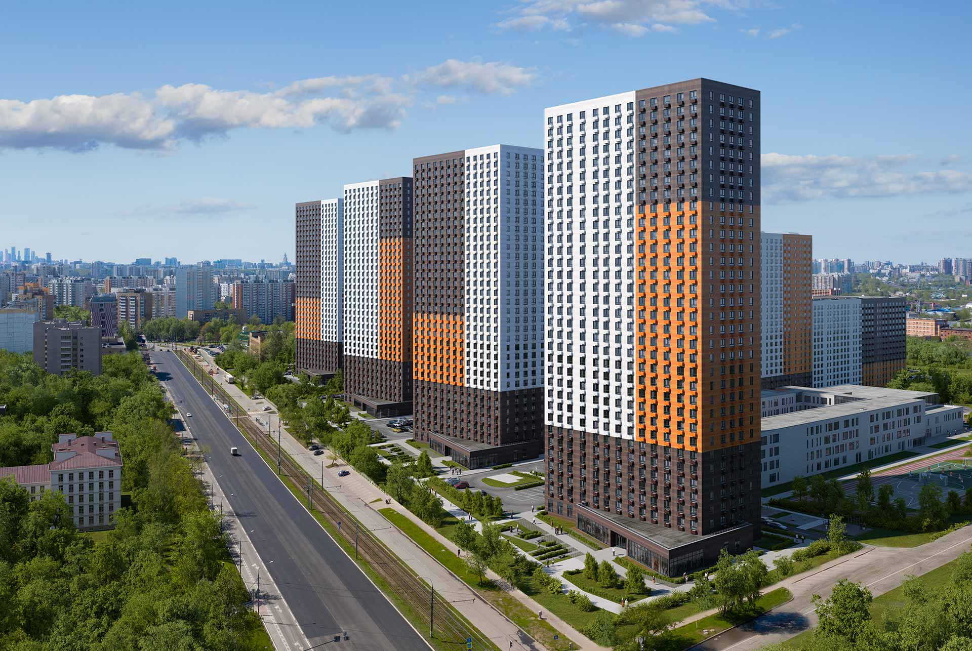 Для проекта будут построены десять жилых корпусов, два детских сада, школа, два многоуровневых паркинга и гостевая парковка.