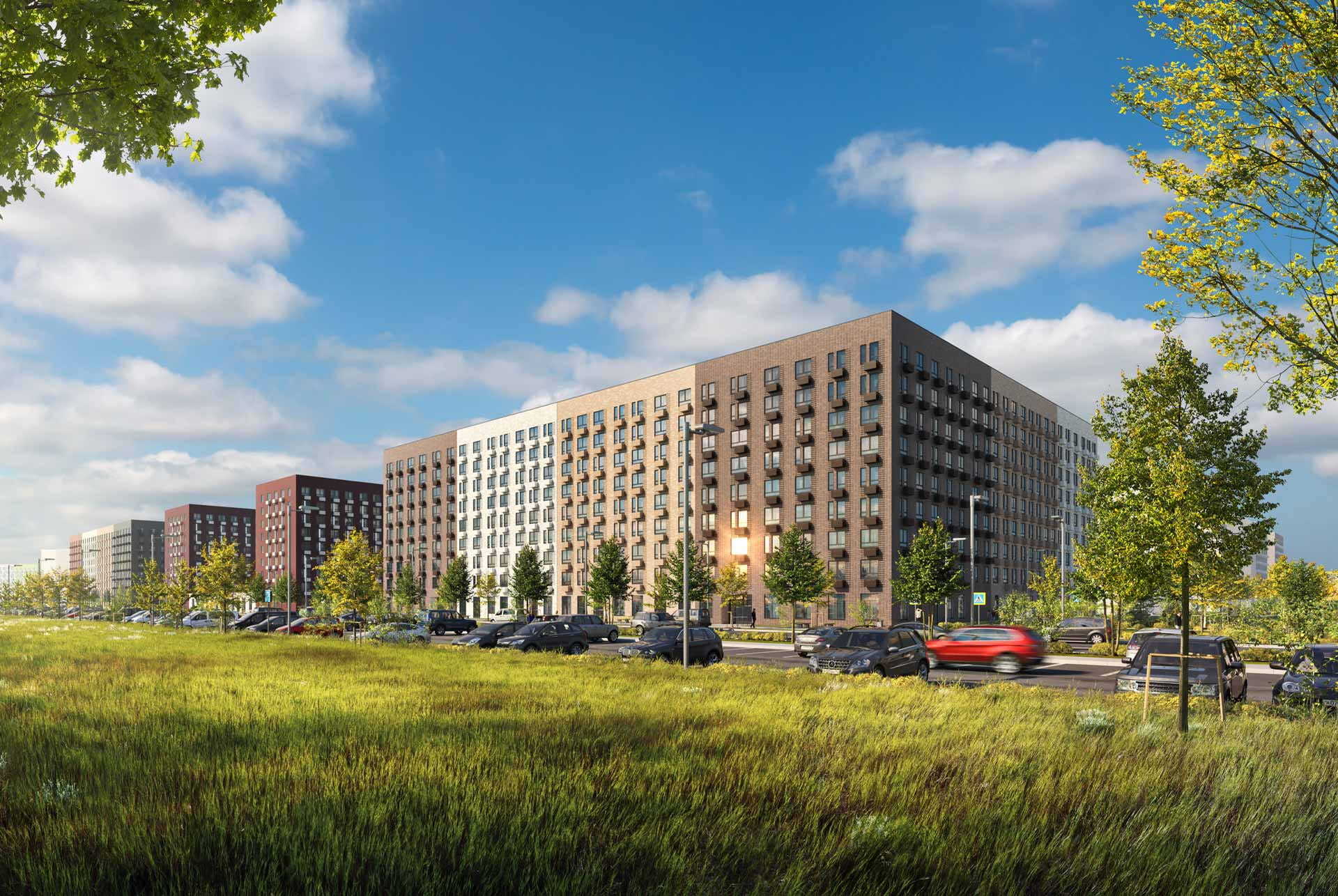 В корпусе 9 будет четыре просторных и светлых подъезда: все они расположены на уровне земли, с выходами во двор и на улицу. На первых этажах разместятся магазины, кафе и другие сервисы. В зелёном дворе-парке будут оборудованы современные детские и спортивные площадки, обустроены места для отдыха.