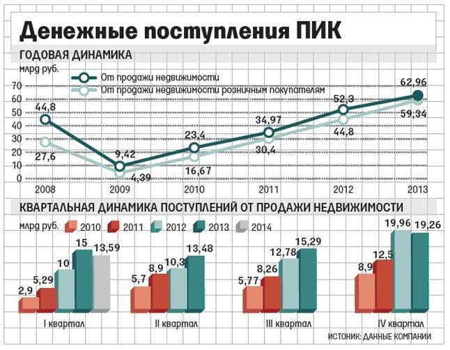 В I квартале 2014 г. группа компаний ПИК передала покупателям 153000 кв.м недвижимости и получила от их продажи 13,59 млрд руб., гласит сообщение компании. В квадратных метрах это на 10,5% меньше, чем годом ранее, в деньгах - на 9,4% меньше. С 2010 г. квартальные продажи ПИК год от года стабильно росли (см. график), единственное падение было в IV квартале 2013 г., но гораздо меньшее - на 3,5%.
