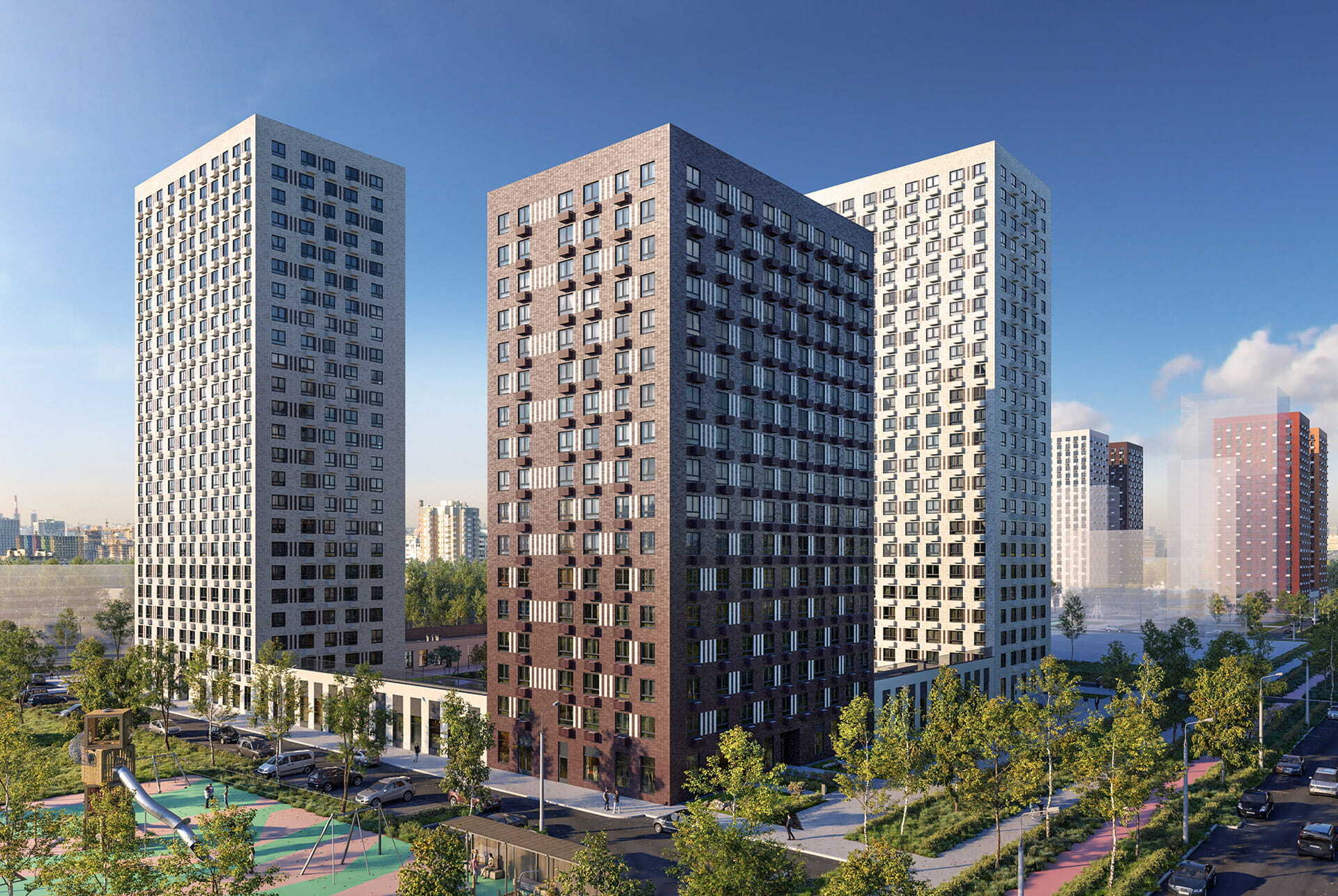 Высота корпусов — 17 и 24 этажа. В домах будут просторные и светлые подъезды на уровне земли с выходами во двор и на улицу. На первом этаже разместятся магазины, кафе и другие сервисы. На подземном этаже предусмотрены индивидуальные кладовые.