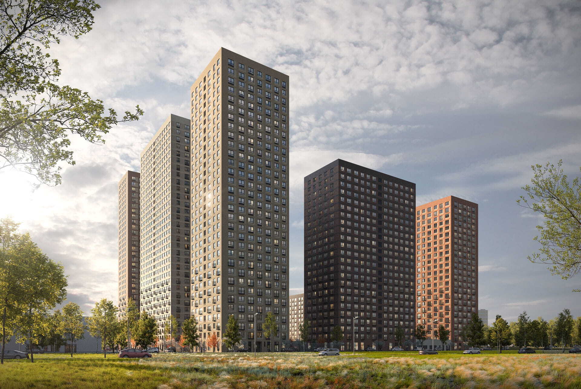 Высота корпусов — 32 этажа. На первом этаже разместятся магазины, кафе и другие сервисы. На подземных этажах предусмотрены индивидуальные кладовые.