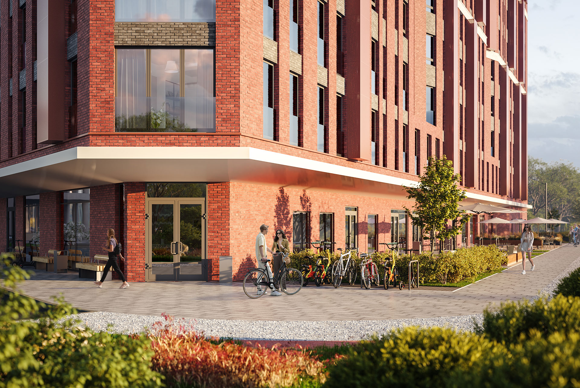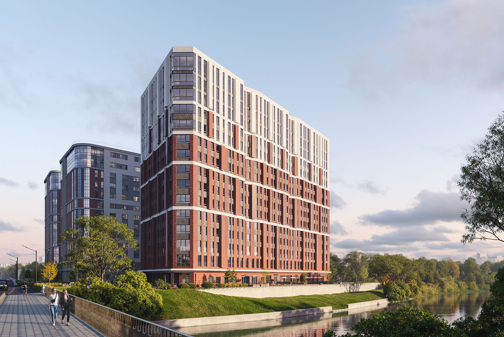 В 15-этажном здании будет просторное дизайнерское лобби, ресторан, круглосуточный ресепшен и консьерж-служба. Для прогулок возле реки благоустроят набережную. Для машин предусмотрена парковка и подземный паркинг.