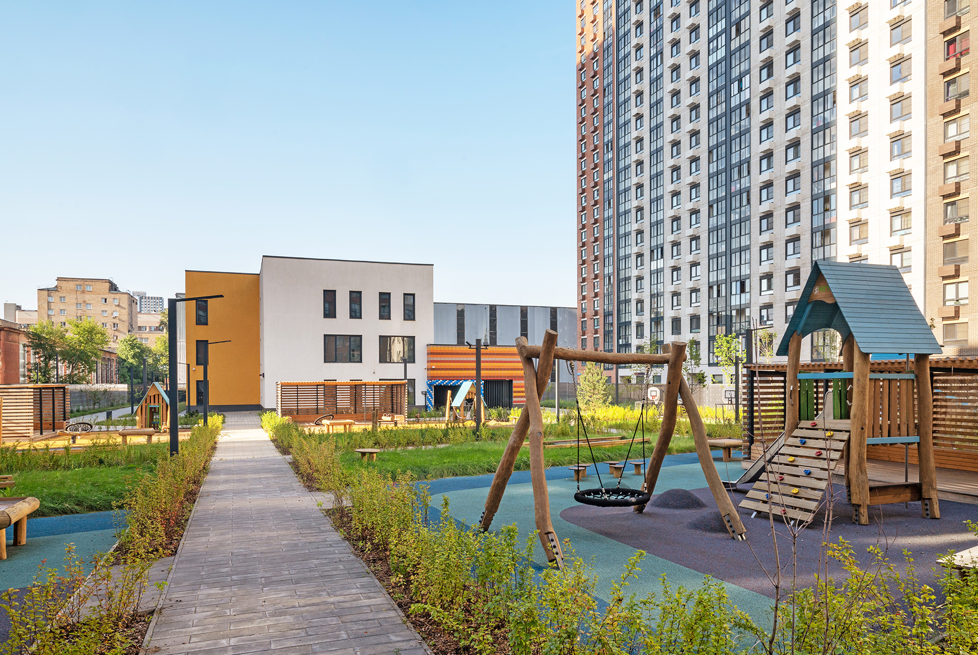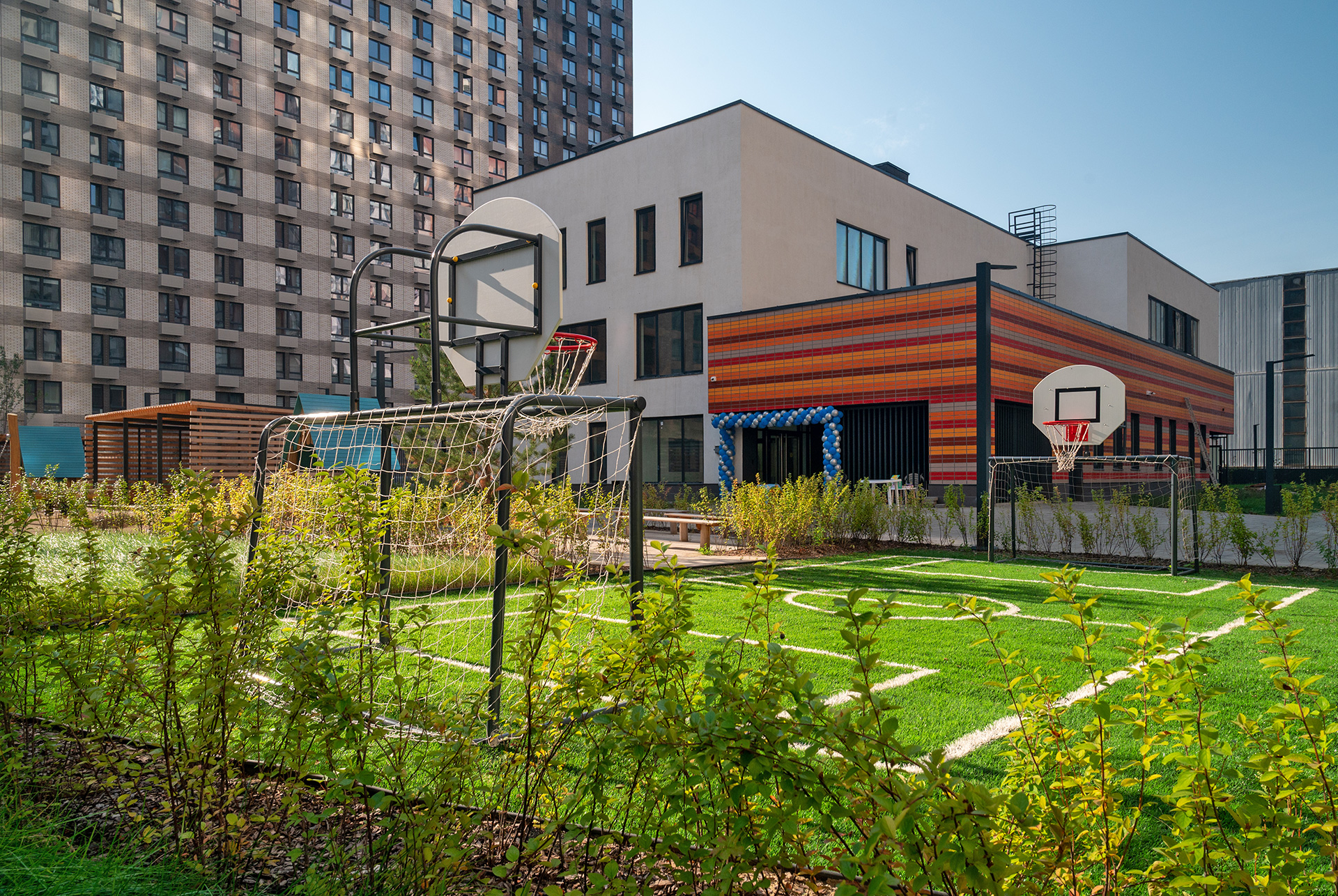 В детскому саду будут работать психологи и логопеды, предусмотрены отдельные помещения для занятий спортом, музыкой и развивающих кружков. На первом этаже находятся выходы к спортивной и игровым площадкам с теневыми навесами — здесь дети смогут играть и заниматься физкультурой. Все входы расположены на уровне земли, без порогов и перепадов по высоте.