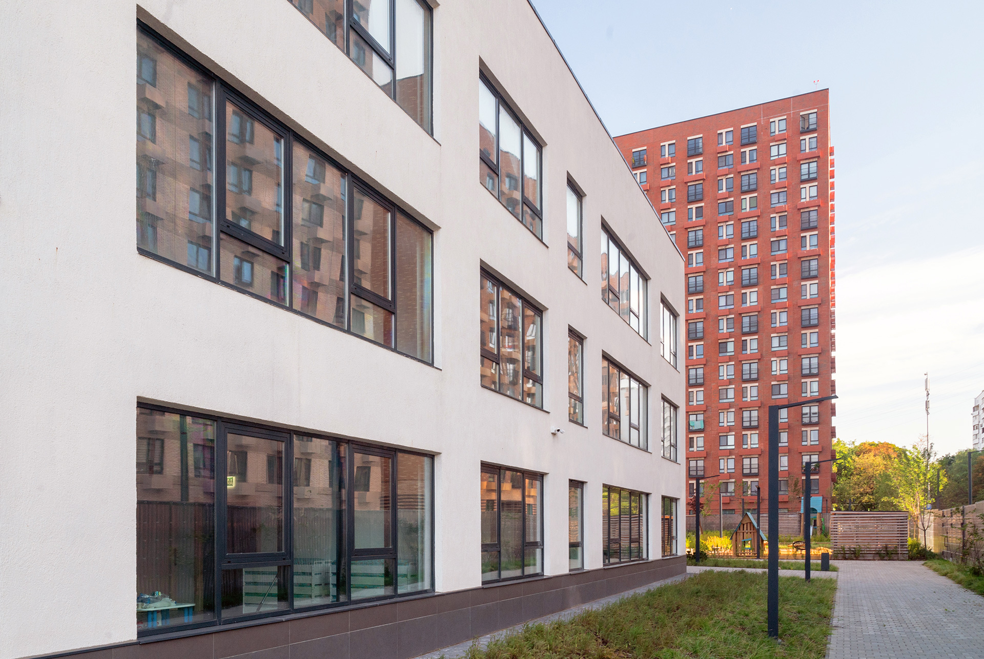 Трёхэтажное здание детского сада построено по индивидуальному проекту с максимально эффективным использованием каждого метра — без лишних коридоров, холлов и тёмных помещений. Вокруг здания — обустроенная территория для прогулок и игр на свежем воздухе.