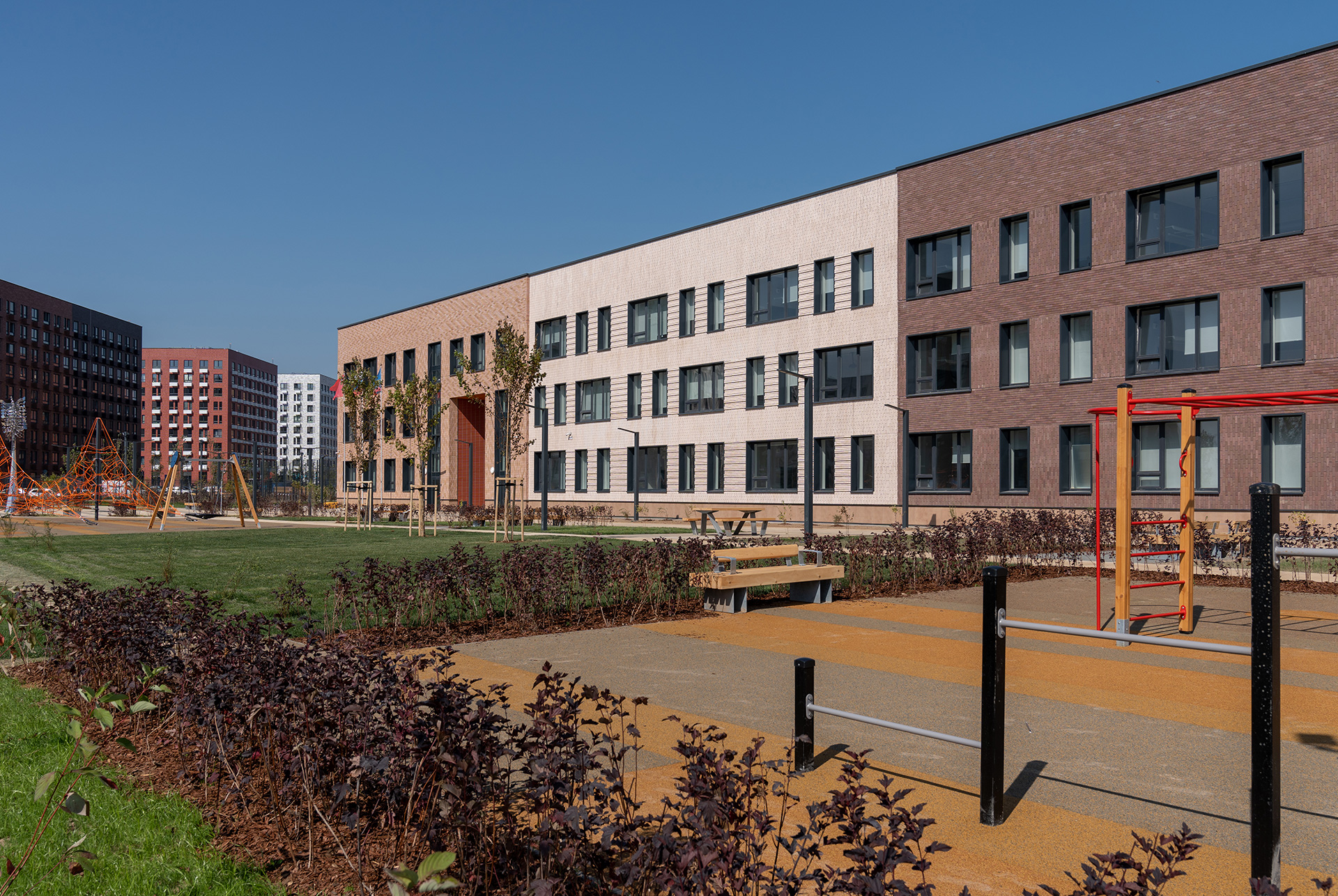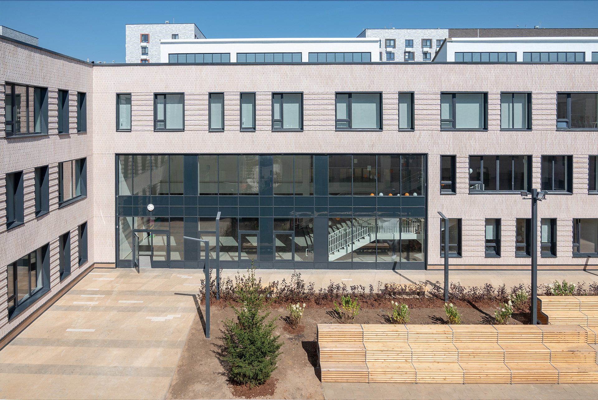 Рядом со зданием мы посадили плодовый сад и подготовили площадки для выращивания овощей и цветов. Здесь школьники научатся ухаживать за растениями и познакомятся с их жизненным циклом. На территории также есть площадки, где дети могут гулять и играть, и кинетическая скульптура, элементы которой движутся от малейшего дуновения ветра. Она эффектно выглядит в любую погоду и в любое время суток.