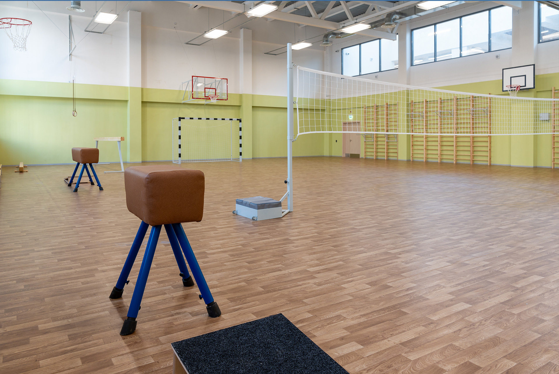 Большое внимание мы уделили спортивной зоне новой школы. Внутри предусмотрено два спортивных и два хореографических зала, а на её территории — беговая дорожка, спортивная для гимнастики, сдачи норм ГТО и прыжков в высоту.
