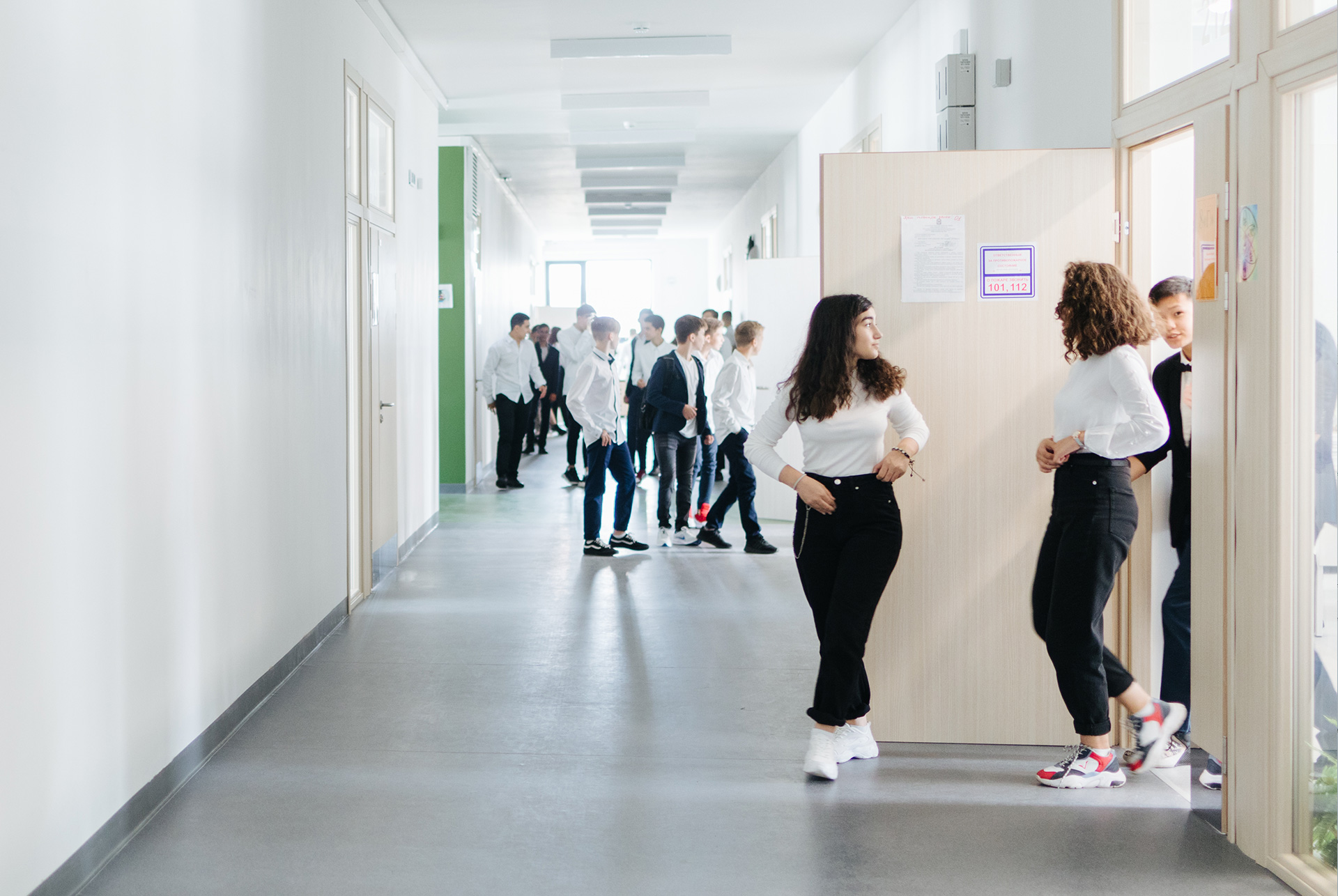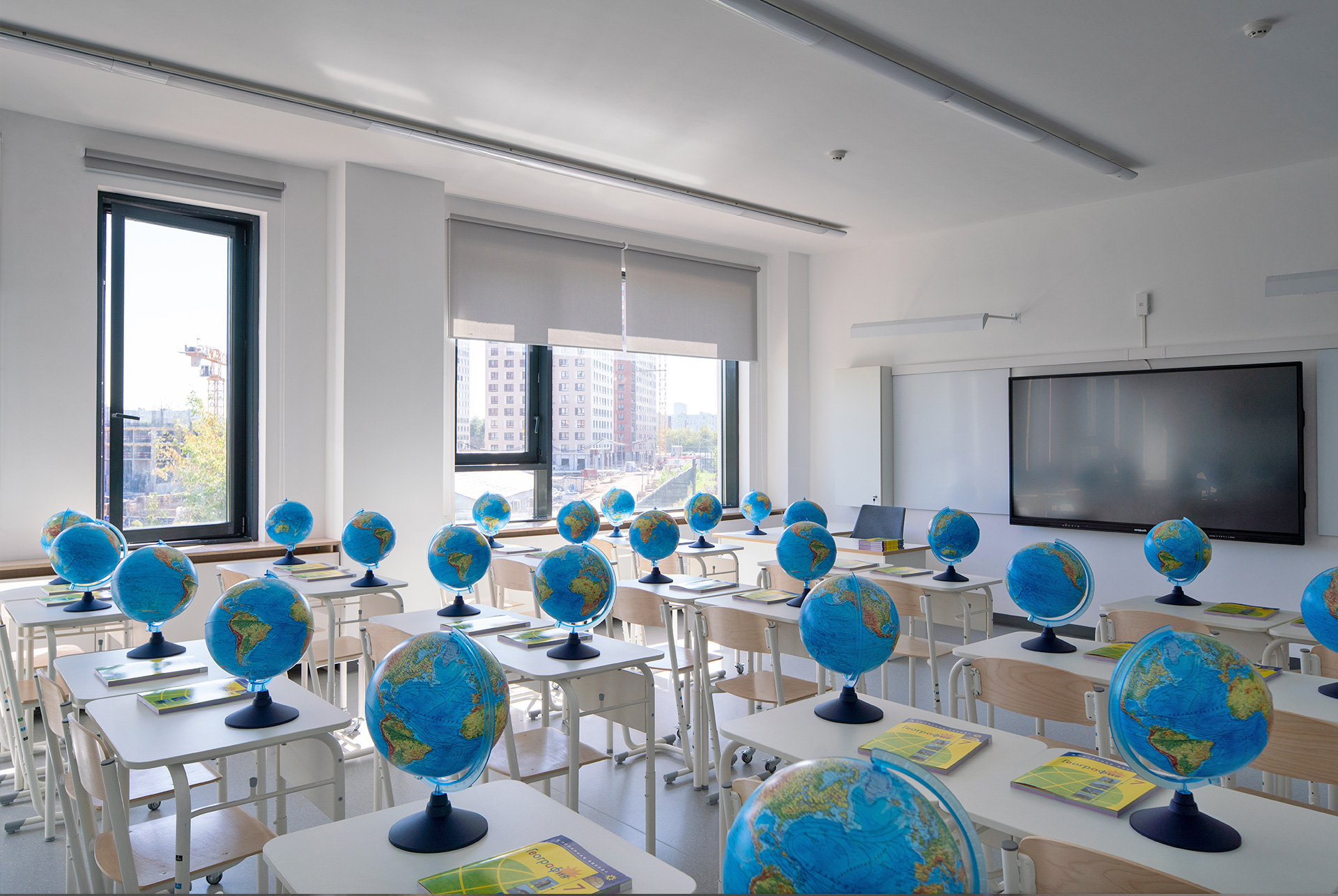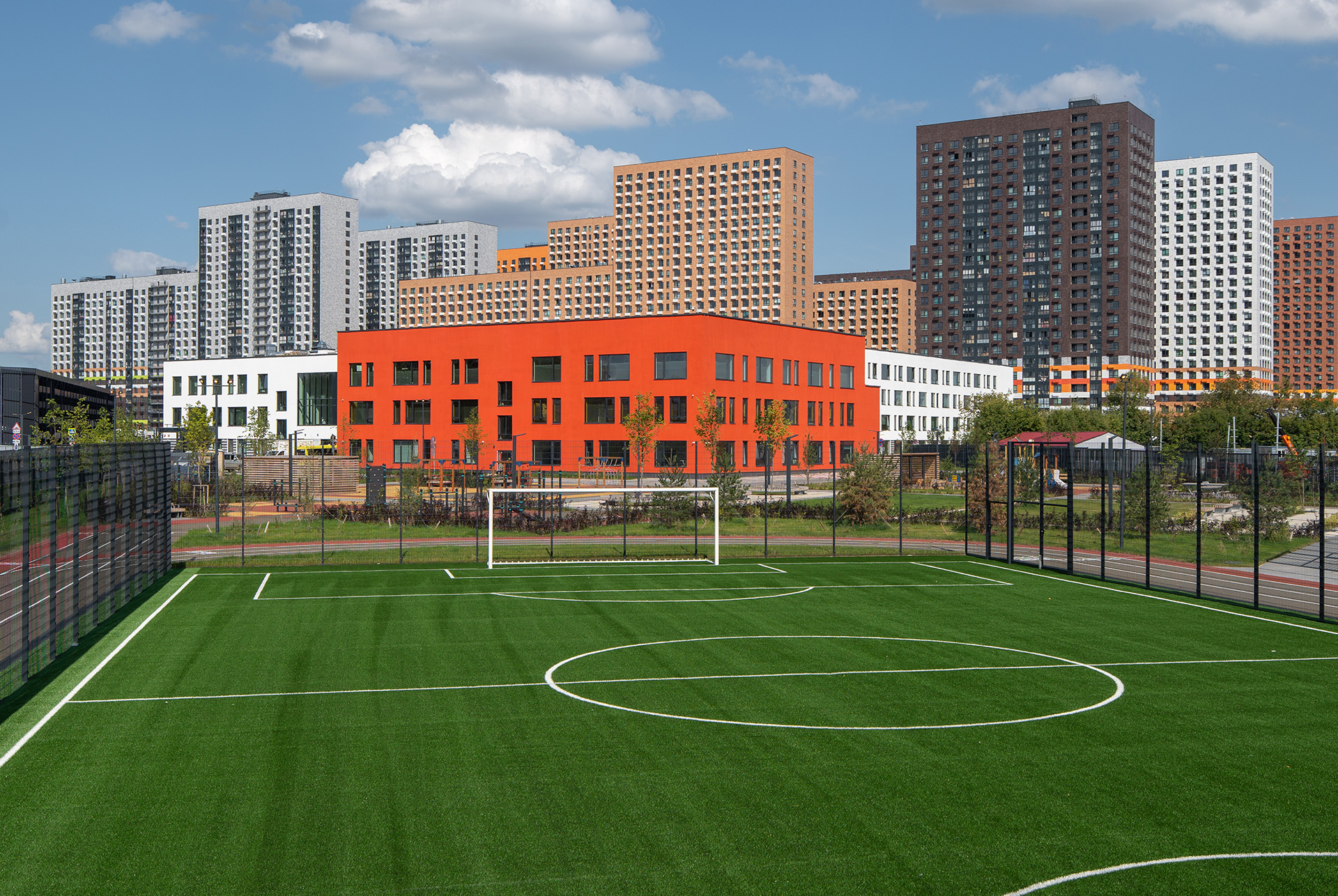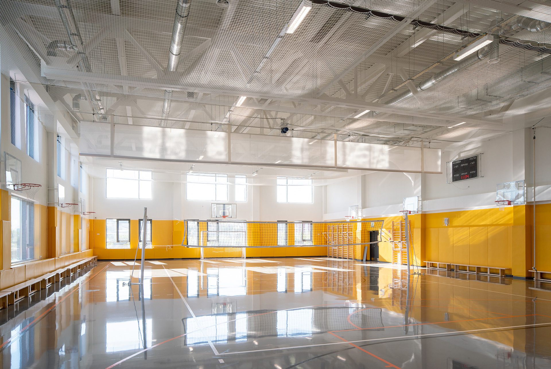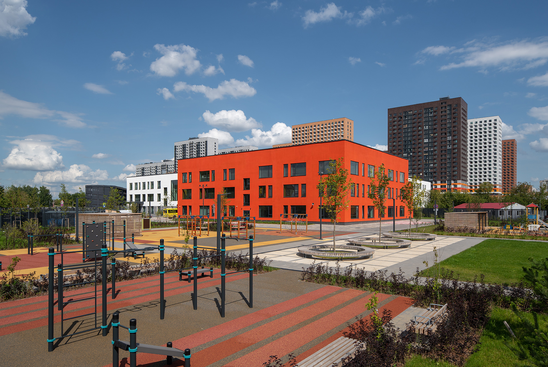 Школа построена по принципам безбарьерной среды, чтобы маломобильным детям было удобно во время занятий и прогулок.