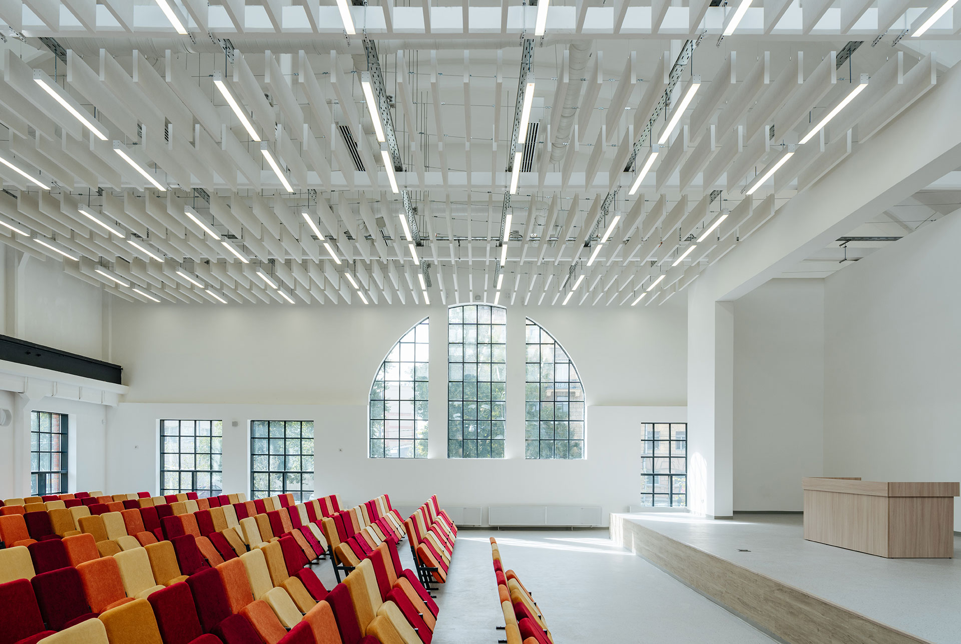 При отделке нами было сохранено или восстановлено архитектурное и художественное оформление, а также материалы и эстетика, характерные для построек эпохи модерна. В оконных рамах вновь появилась мелкая «клетчатая» расстекловка, а на крыше — пять зенитных фонарей, вид которых удалось воссоздать благодаря историческим фотографиям.