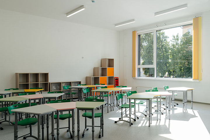 Благодаря большим окнам, которые занимают целых 25% площади стен, в учебных классах будет много естественного света, а интерьер, оформленный в светлых тонах, поможет детям концентрироваться на учёбе. Кроме кабинетов, на первом этаже школы расположены спортивный зал, бассейн площадью больше 200 м², столовая для 150 учеников, а на втором — библиотека, актовый и читальный залы. Все входы расположены на уровне земли, без порогов и перепадов по высоте.