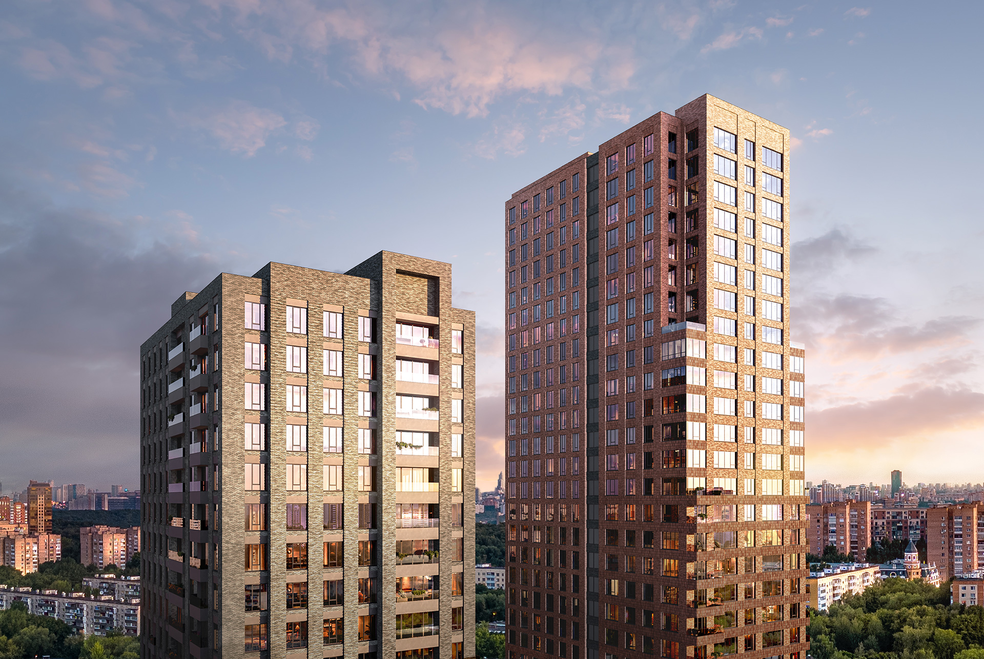 Проект с уникальной архитектурой состоит из двух корпусов высотой 23 и 30 этажей. Благодаря переменной этажности, окнам в пол и большим окнам высотой до 2,1 метра в квартирах всегда будет светло и уютно, независимо от стороны и времени года.