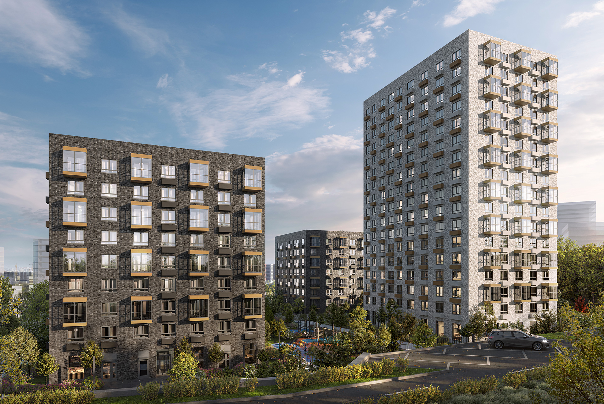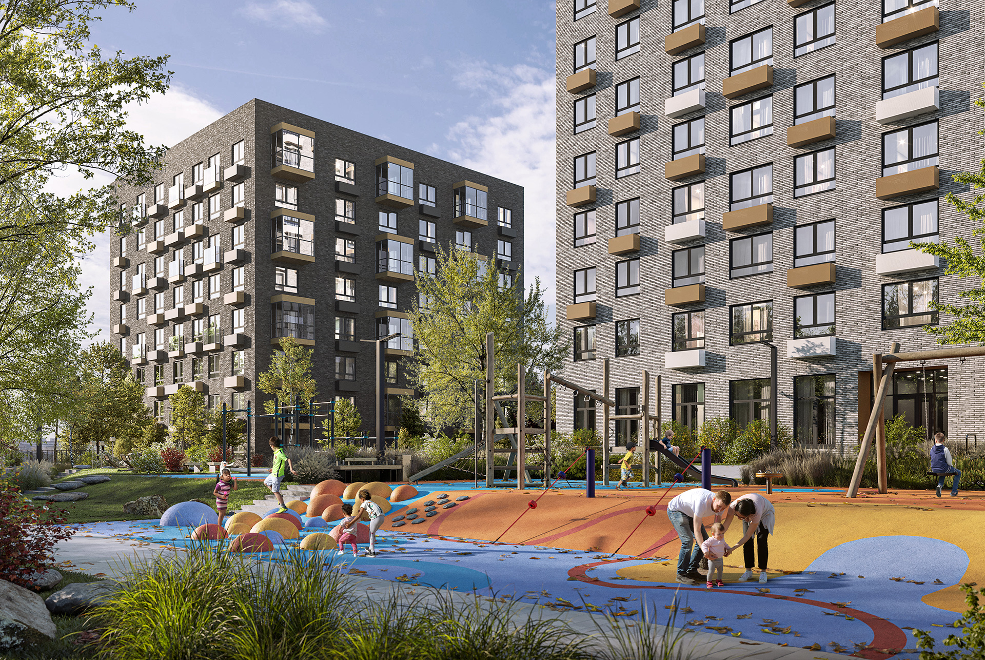 Высота корпусов — от 9 до 17 этажей. В домах просторные подъезды с холлами с дизайнерской отделкой и выходами на уровне земли во двор и на улицу. Во дворах-парках обустроены современные детские и спортивные площадки, есть места для отдыха.
