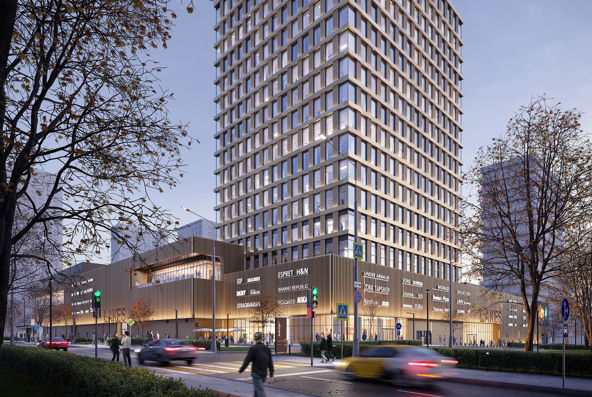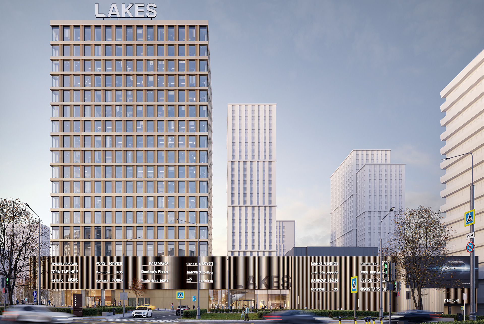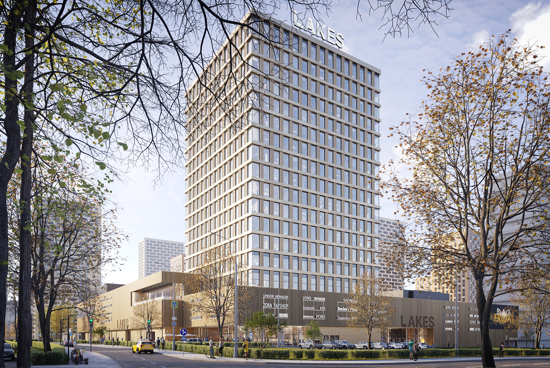 Многофункциональный комплекс Lakes — это 17-этажный торговый и офисный центр. Он разместится на территории квартала «Мичуринский парк», рядом с метро «Озёрная».