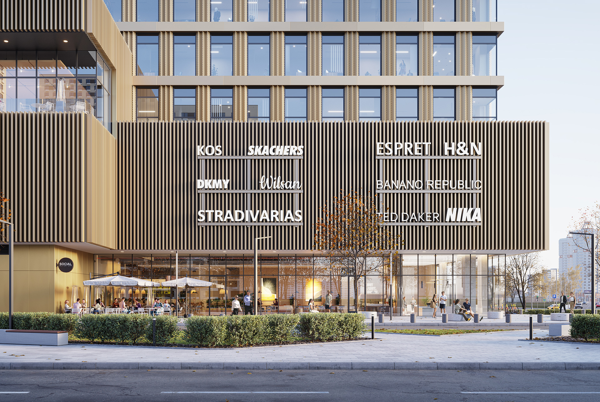 Торговый центр расположится на первых четырёх этажах здания, остальные займут офисы. Это будут пространства свободной планировки класса B+. Площадь помещений — от 53 до 1 370 м². Для владельцев авто предусмотрен подземный паркинг на 238 мест.
