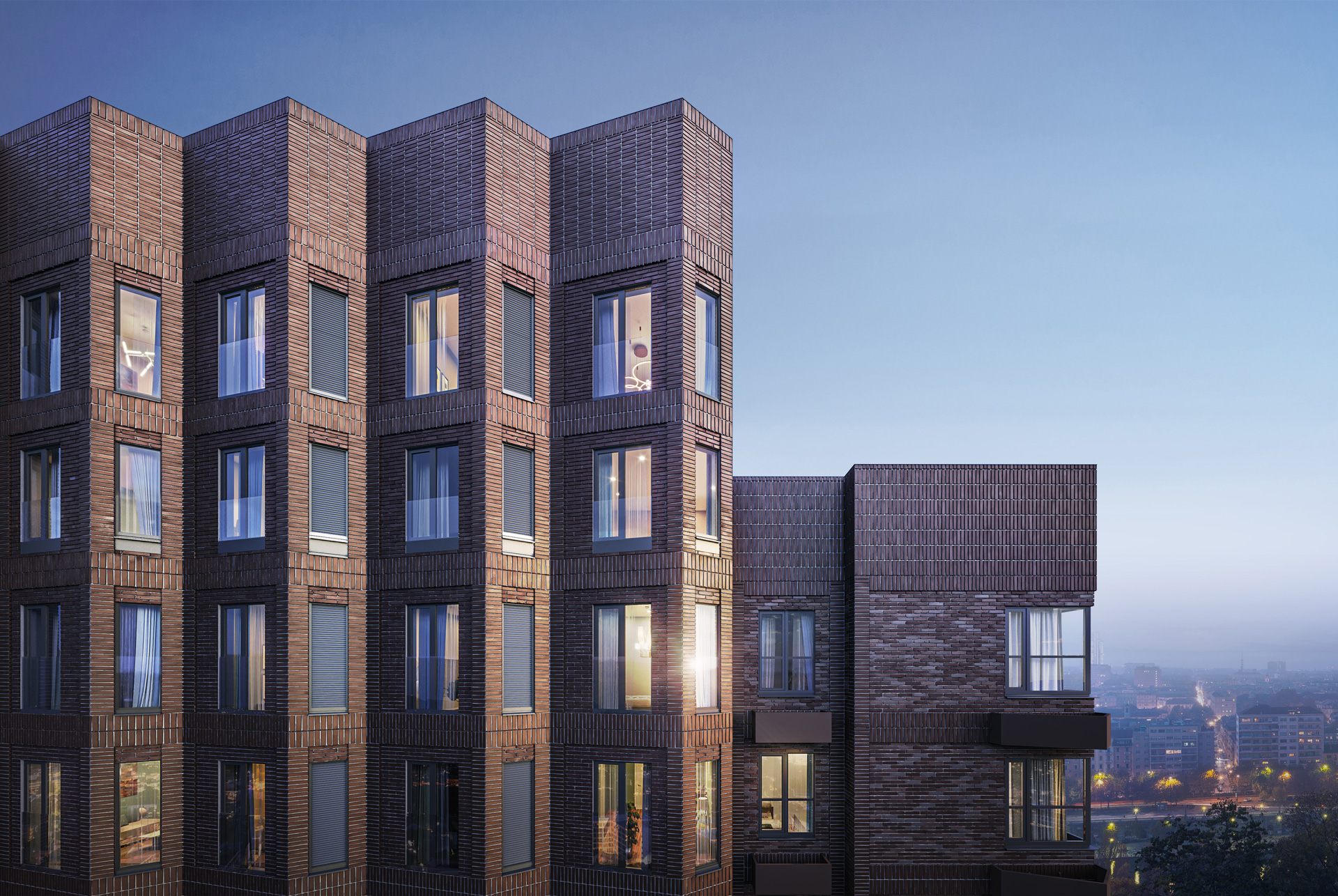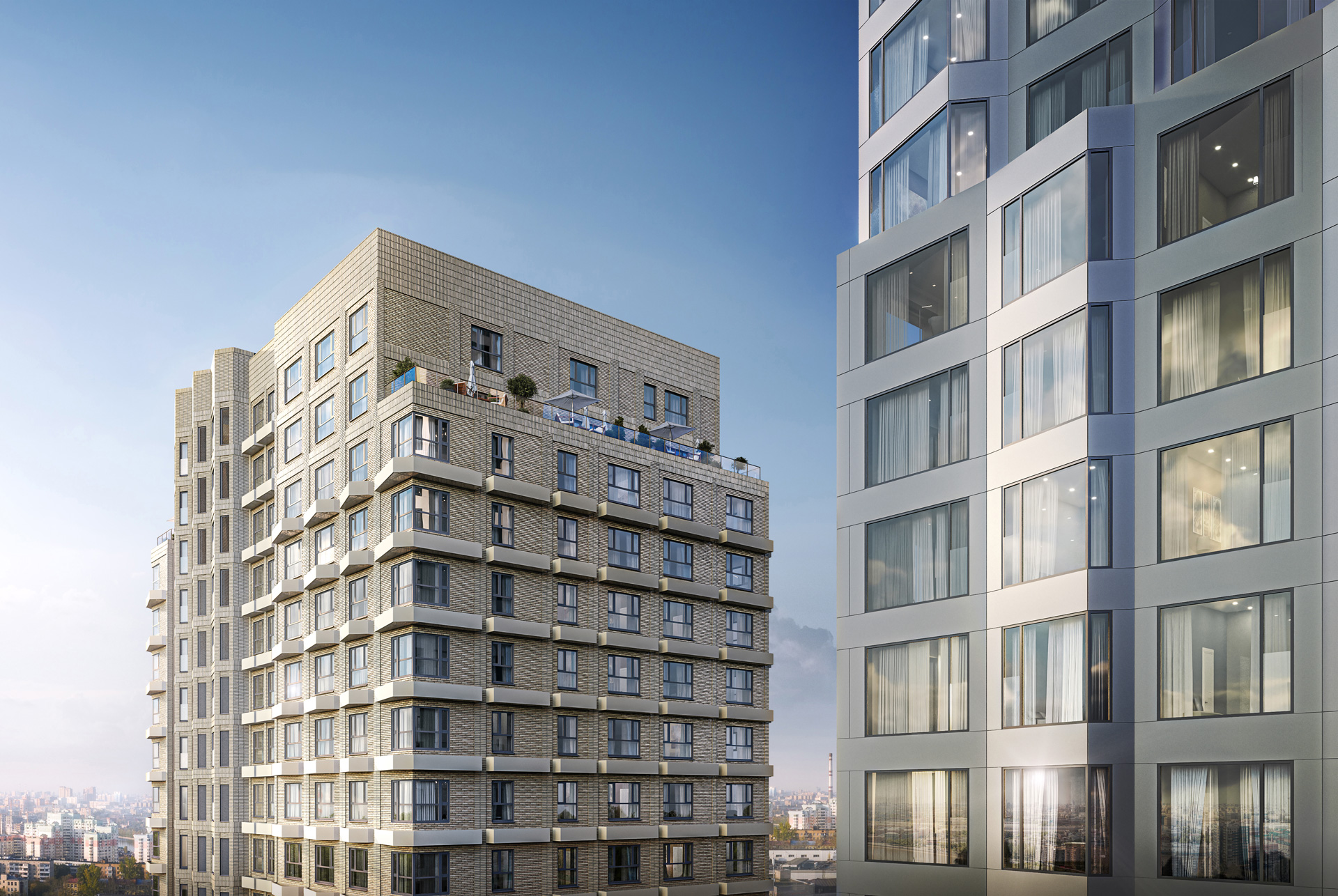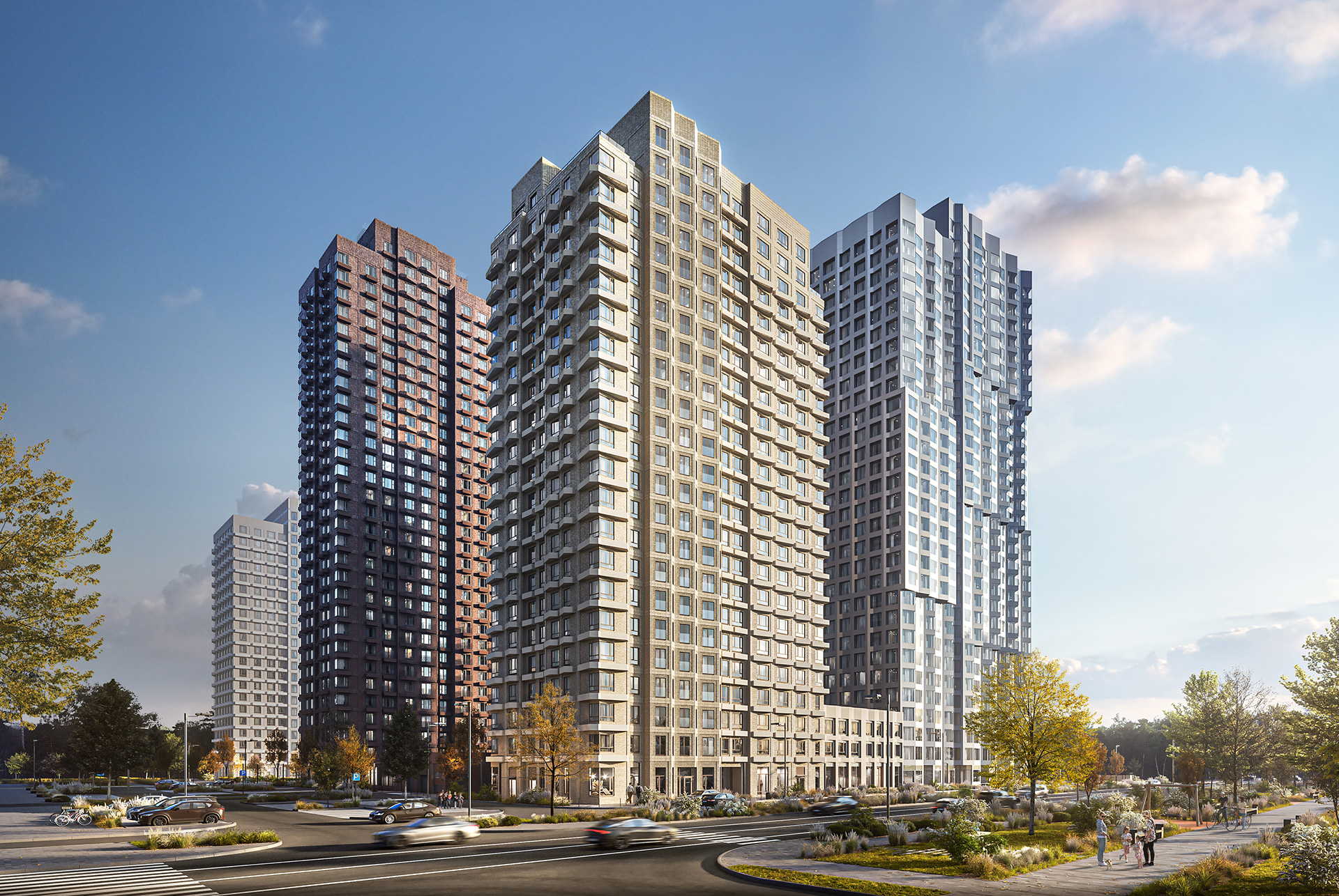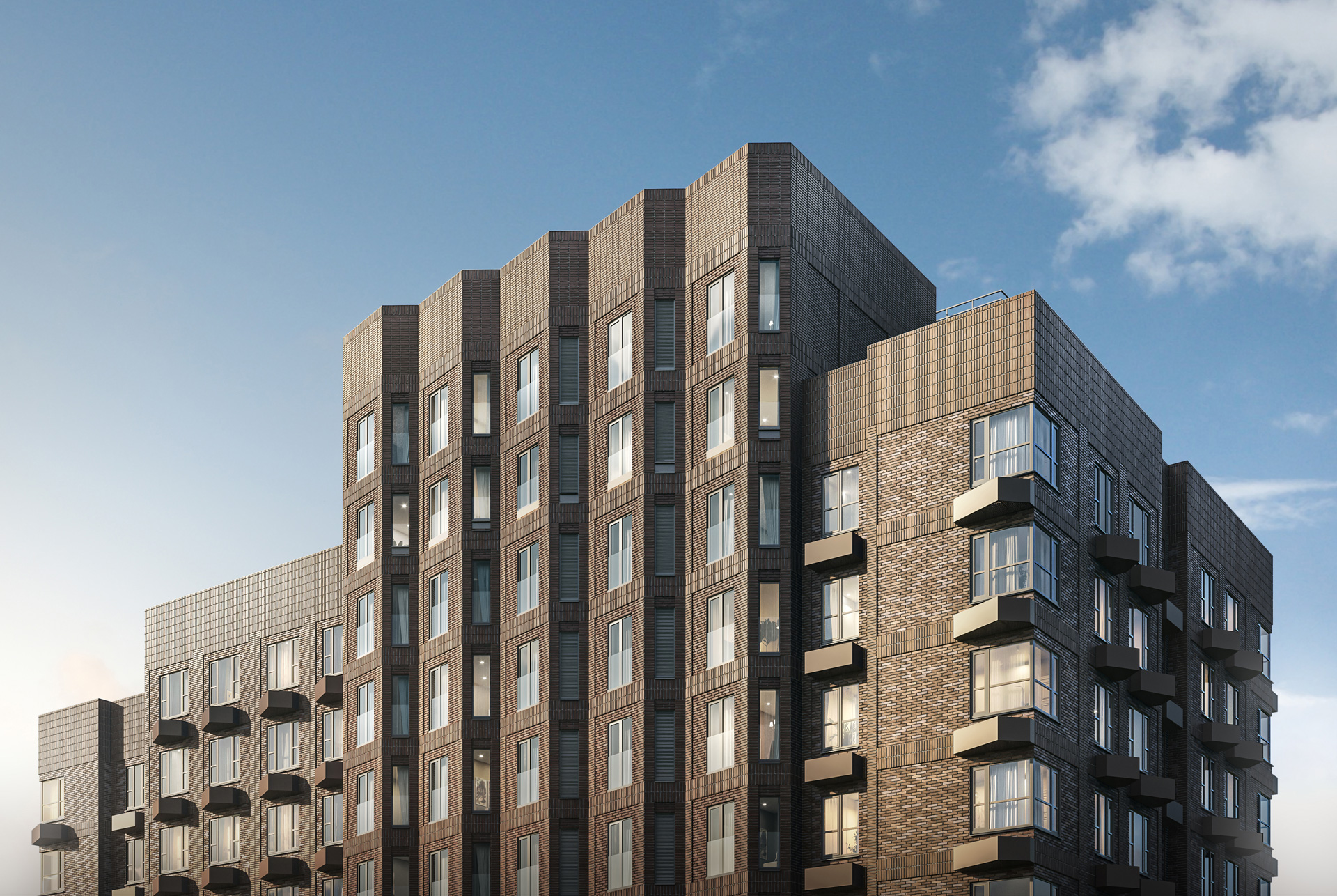 Вертикальный акцент каждой башни — вставка с эркерами, которая пронизывает здания с первого до последнего этажа. Геометрический рисунок складок поддержан формой балконов и других элементов фасада.