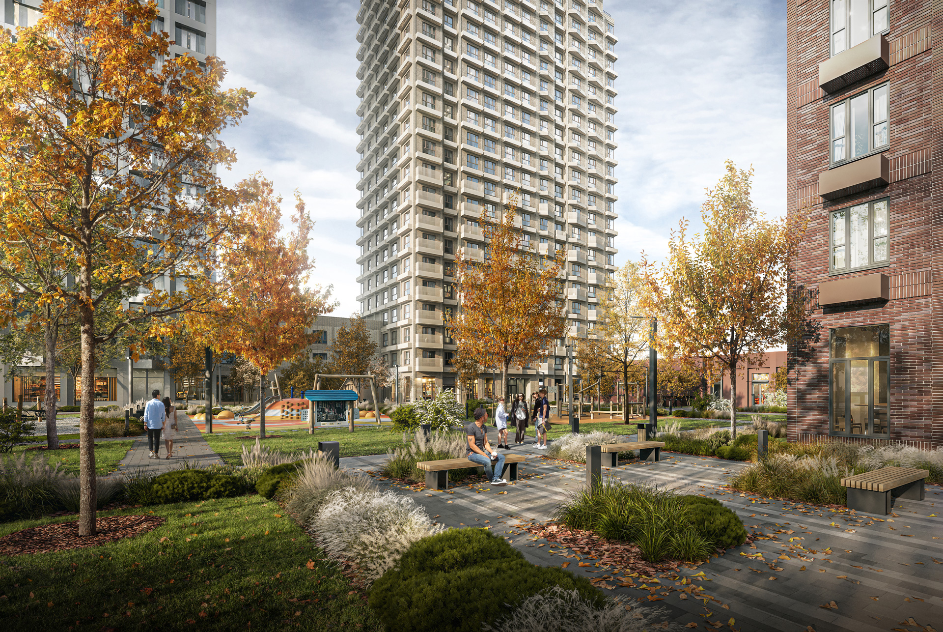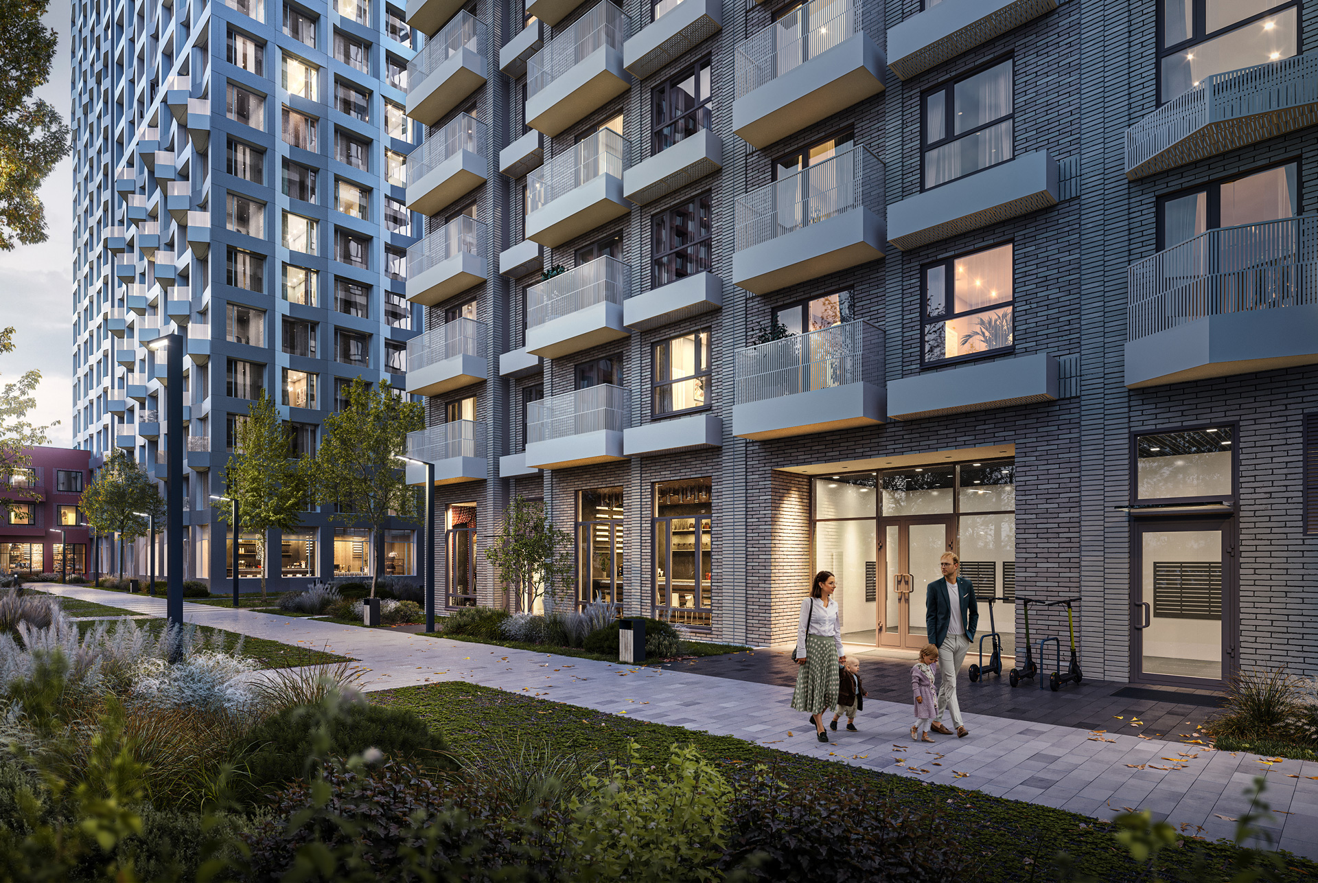 Как и в других проектах «Серии плюс», мы выделили зону city level. Насыщенная фасадная пластика оживляет пространство первых этажей, создавая интересную и комфортную среду для жителей: здесь будет приятно гулять, общаться и просто проводить время.