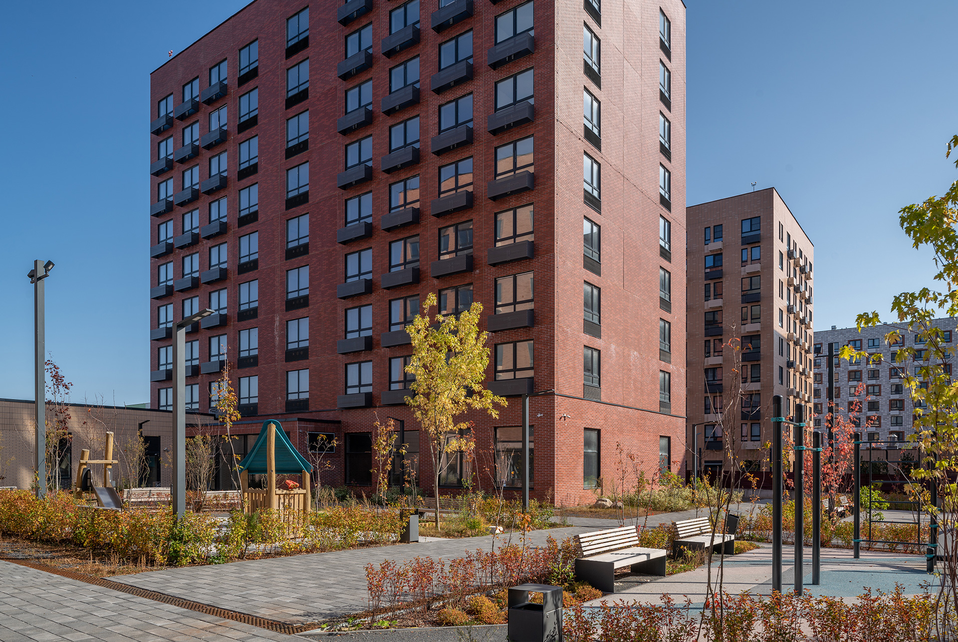 Дом уже построен, и квартиры с готовой отделкой. Высота корпуса — 9 этажей. В доме просторные и светлые подъезды на уровне земли с выходами во двор и на улицу. На подземном этаже предусмотрены вместительные индивидуальные кладовые. В зелёном дворе-парке оборудованы современные детские и спортивные площадки, обустроены места для отдыха.