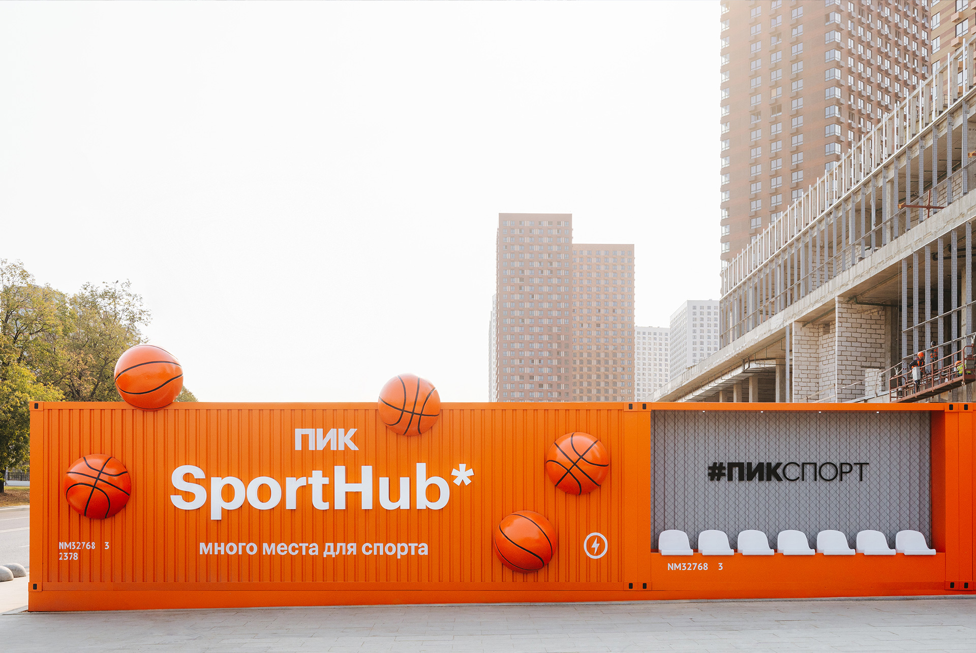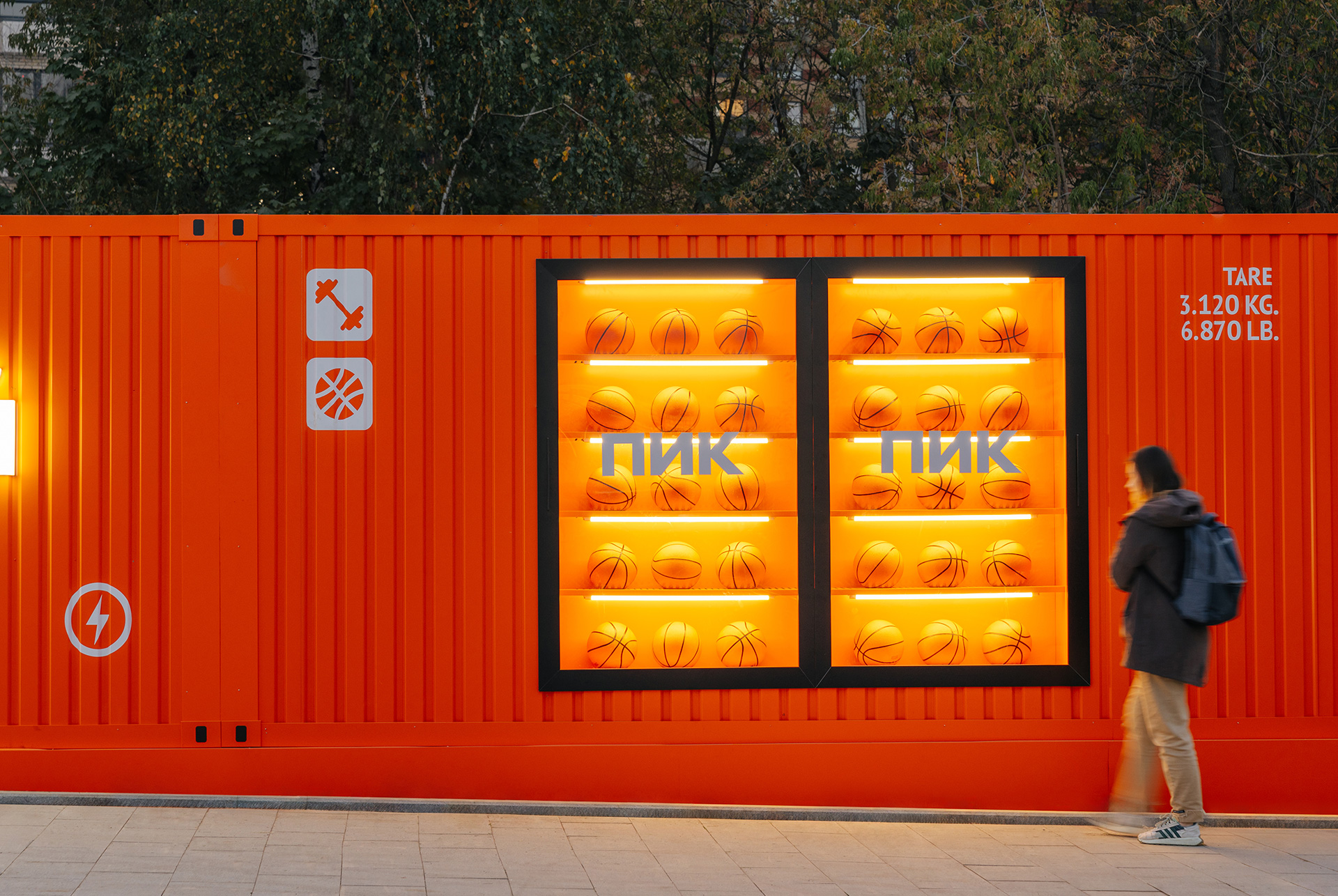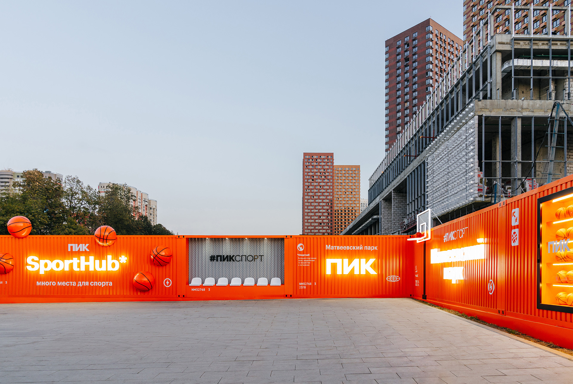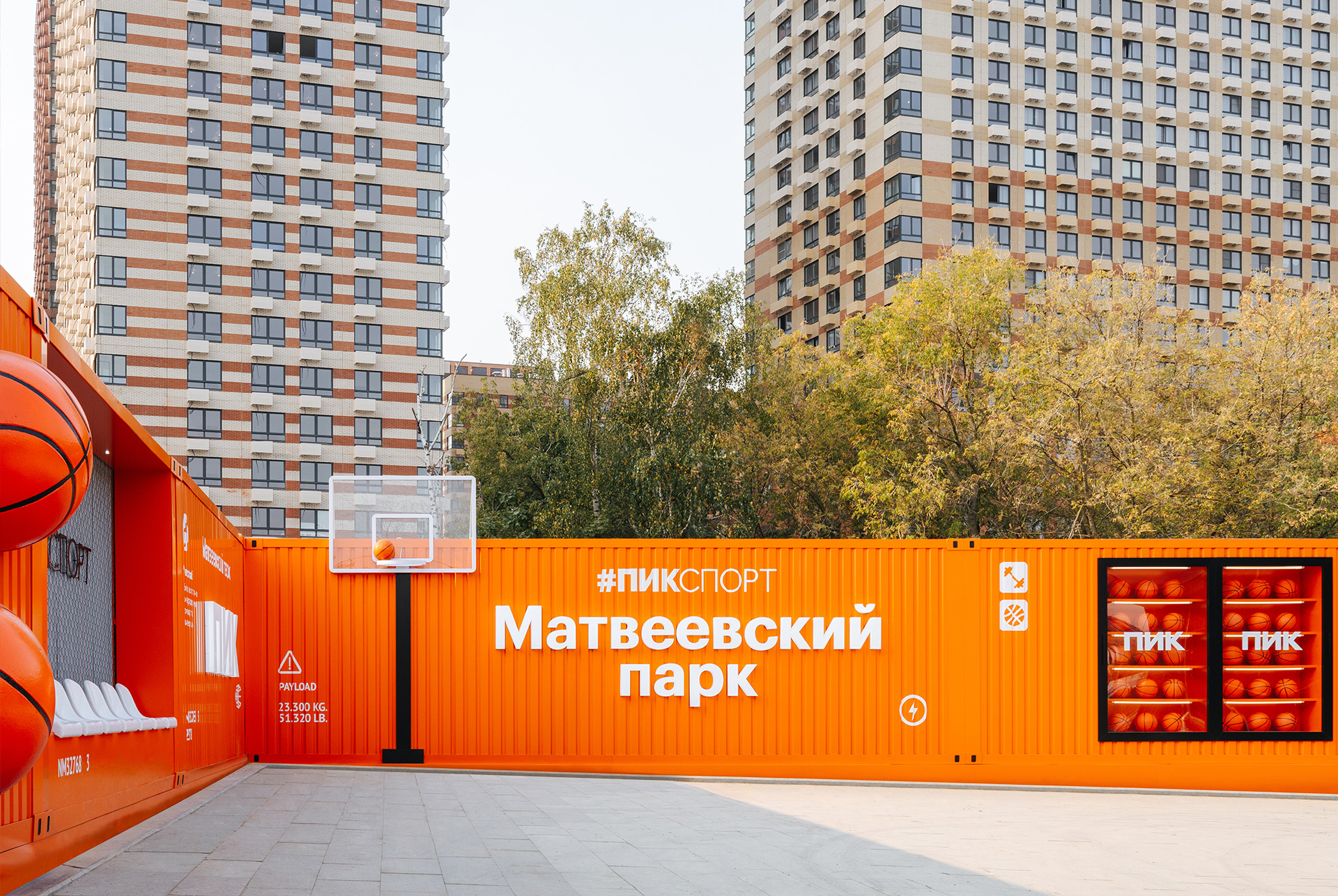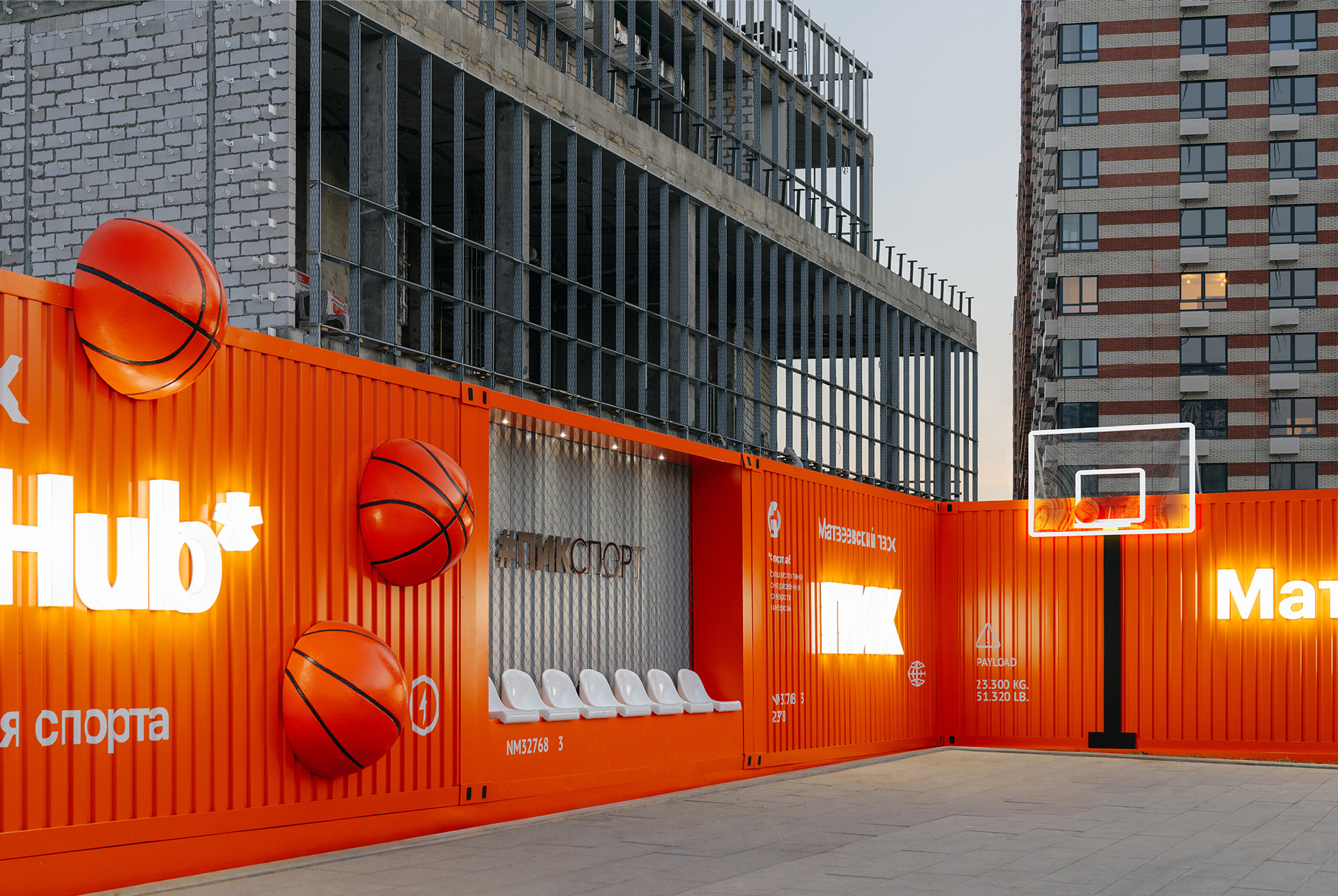 Спортивная фотозона имеет необычный дизайн в стиле фасадов портовых контейнеров, которые окрашены в яркие цвета и создают объёмный 3D-эффект. Здесь есть удобные места для отдыха, витрина с мячами и баскетбольное кольцо. Вечером работает красивая подсветка, которая подчёркивает отдельные элементы.