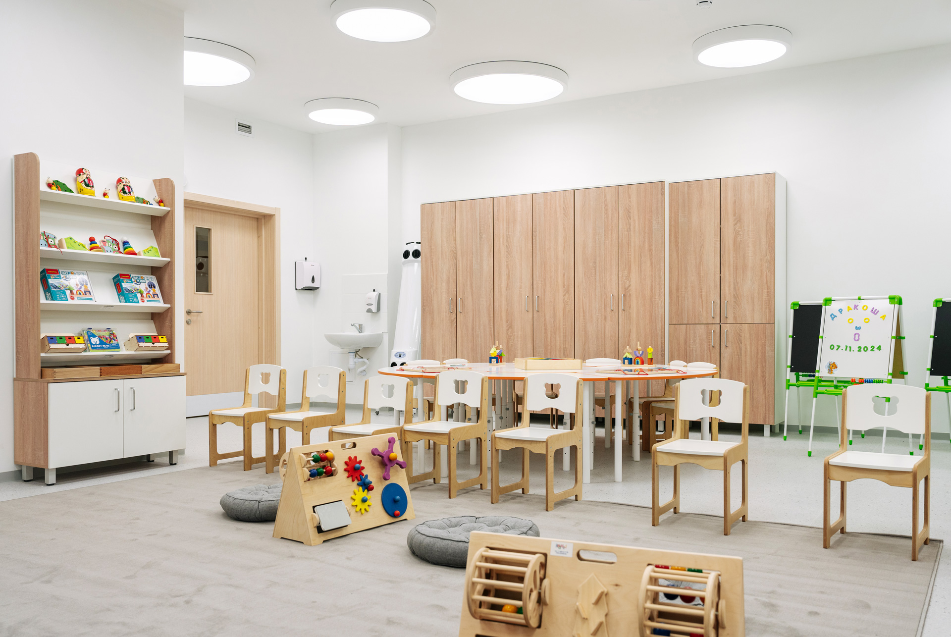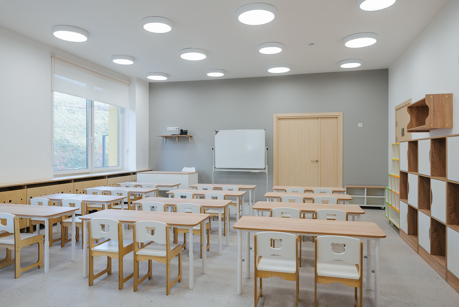 Проект отличается продуманным зонированием, приятными интерьерами и функциональными деталями, которые стимулируют развитие творческих способностей и способствуют обучению. На каждом из трёх этажей созданы учебные классы и игровые комнаты, которые учитывают потребности детей разного возраста; залы для занятий физкультурой и музыкой, столовые и гардеробные.