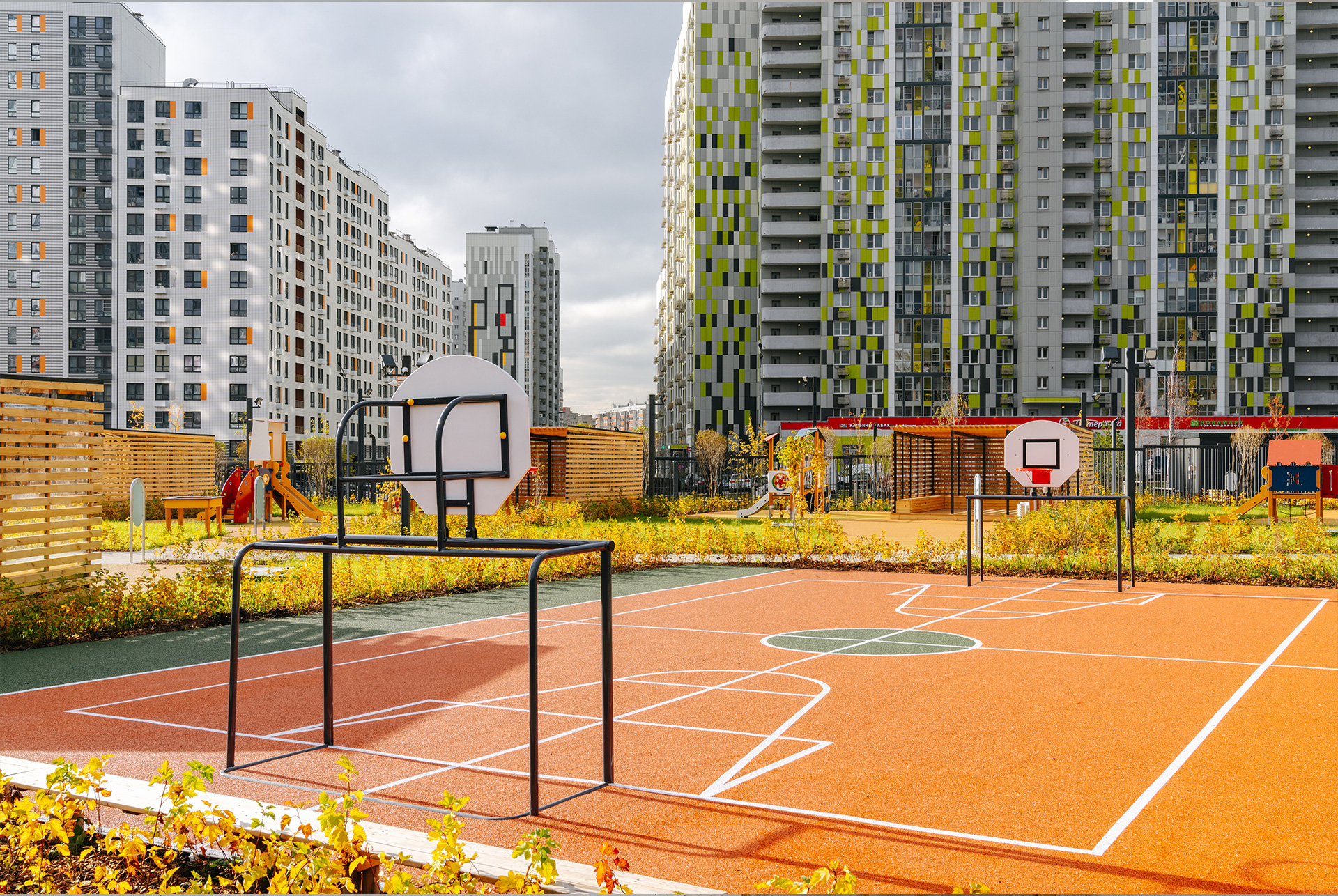 На детских площадках предусмотрены не только обычные навесы и качели, но элементы для развития, экспериментов и активных игр. Это часть концепции «Играй и учись».