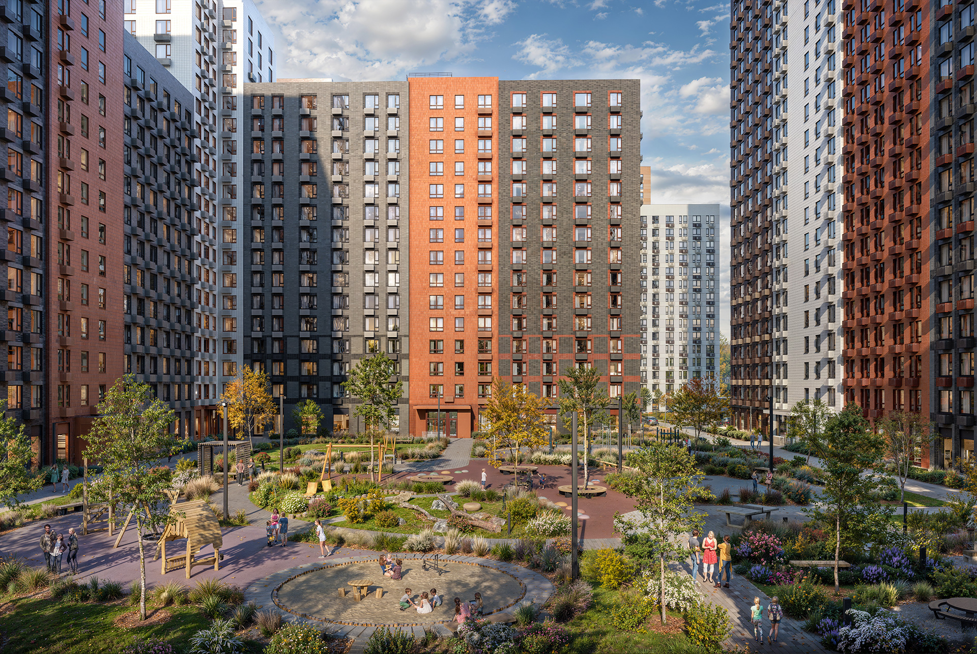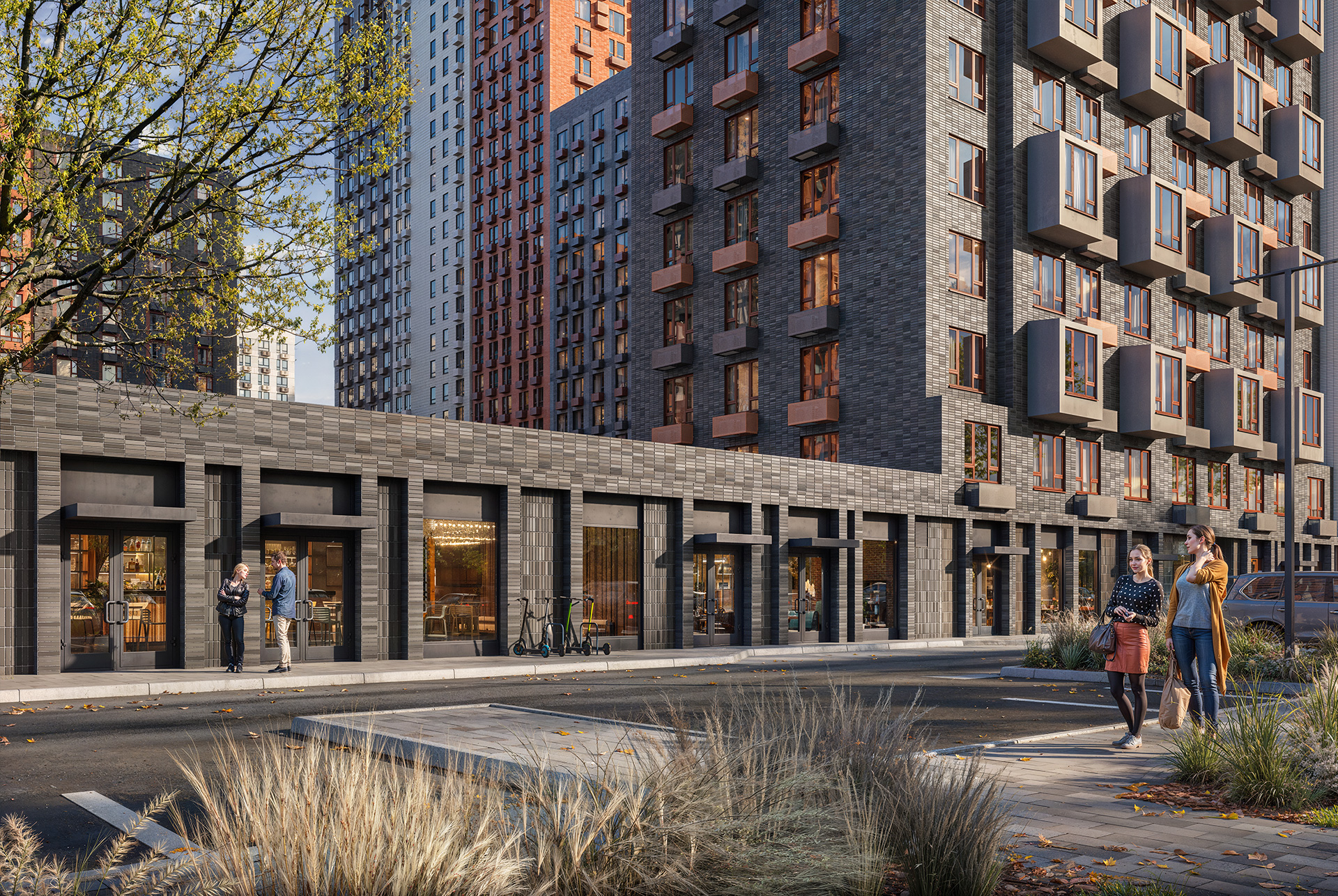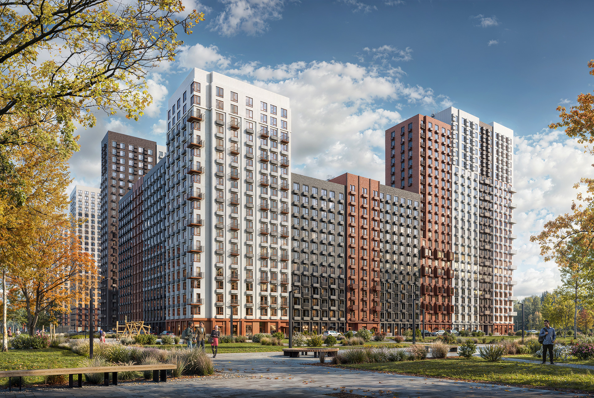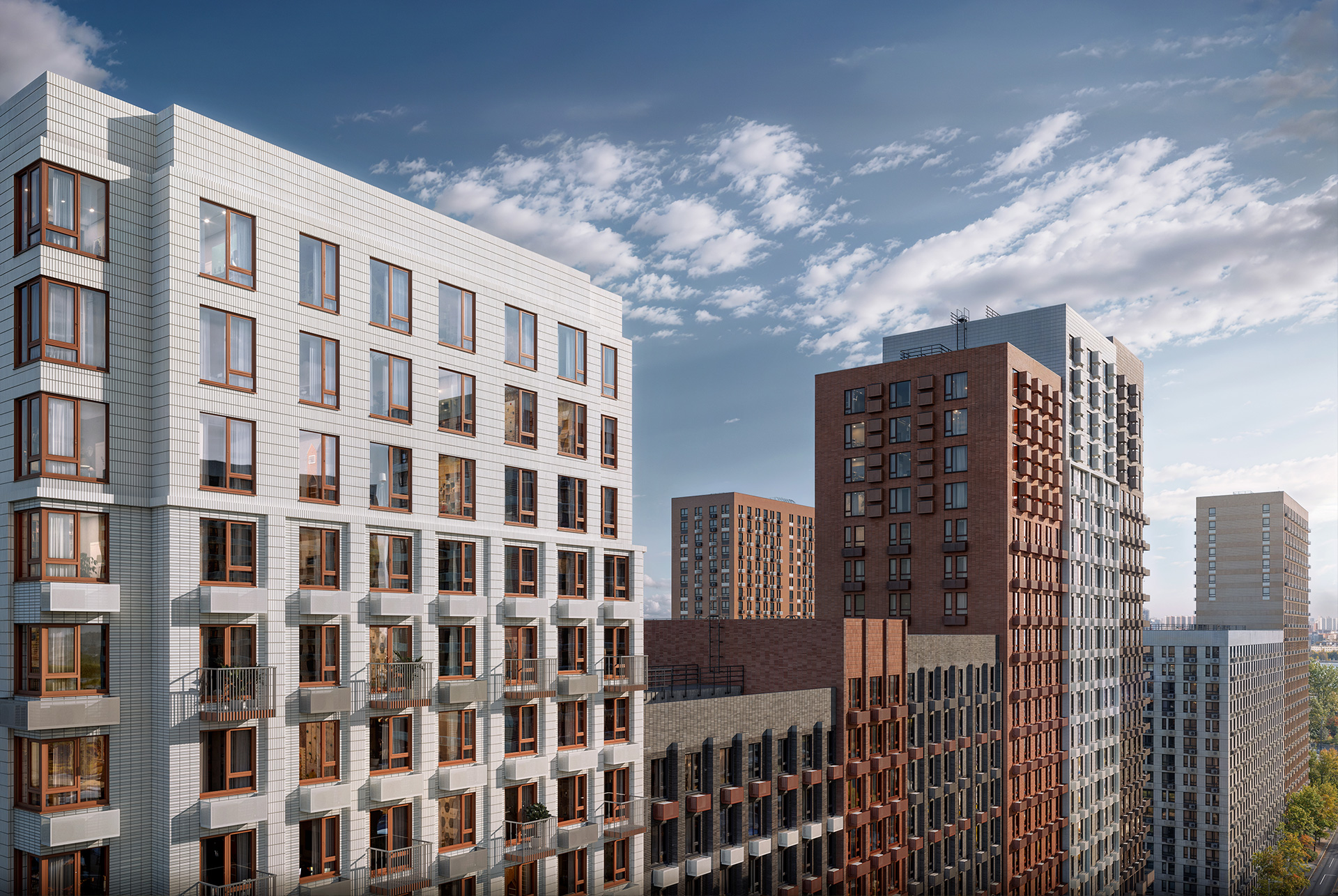 Архитектурная концепция квартала разработана с вниманием к деталям. В оформлении фасадов преобладают благородные природные оттенки: камень, кирпич, терракота и молочно-белый цвет. А отдельные элементы, такие как угловые балконы, создают неповторимый архитектурный ритм.