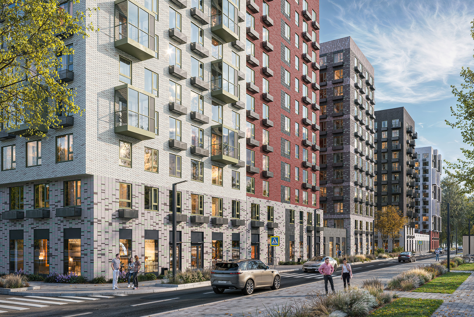В оформлении фасадов используются спокойные оттенки: молочно-белый, кирпичный и тёмно-коричневый. Они формируют гармоничный образ квартала в сочетании с нестандартной формой застеклённых балконов.
