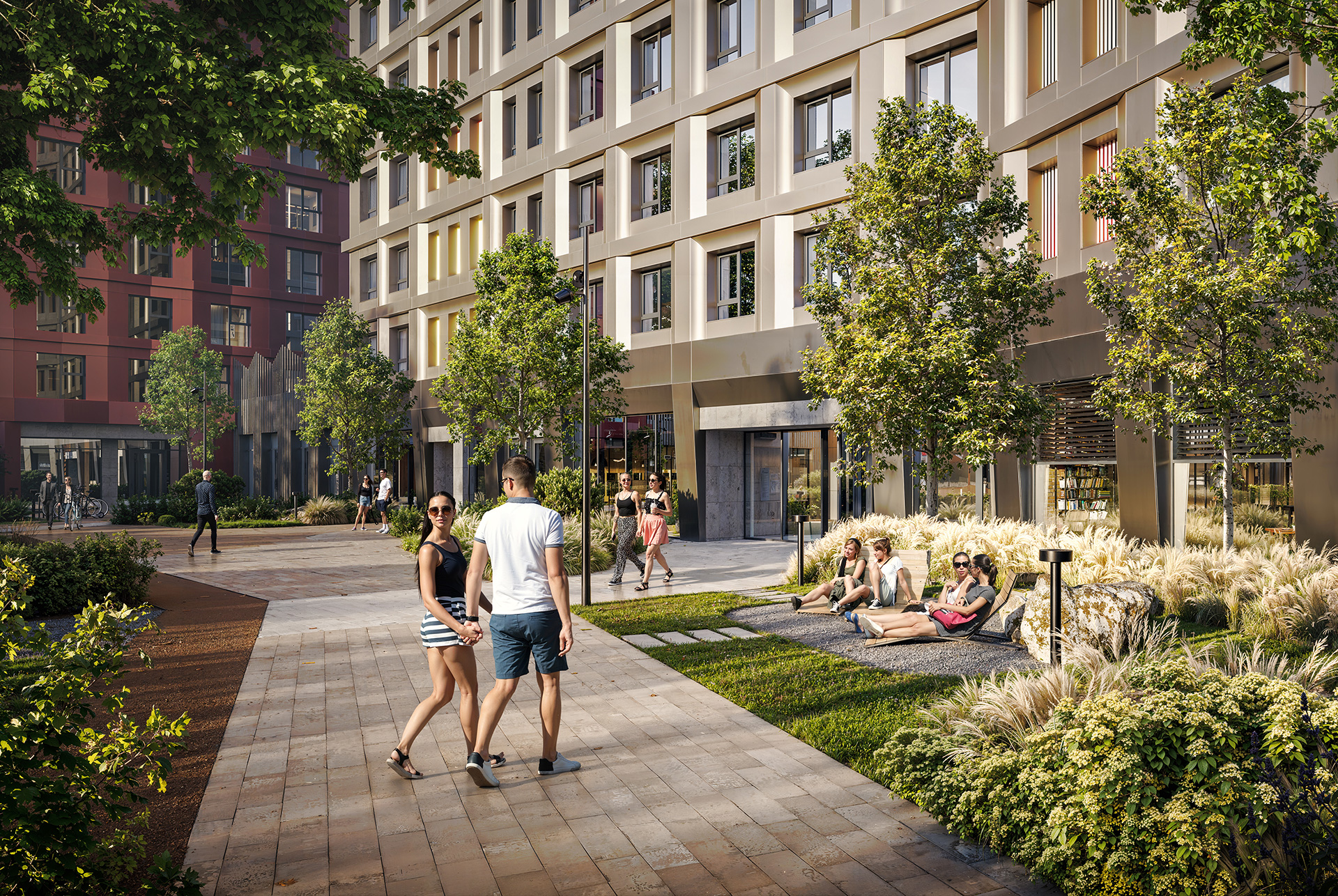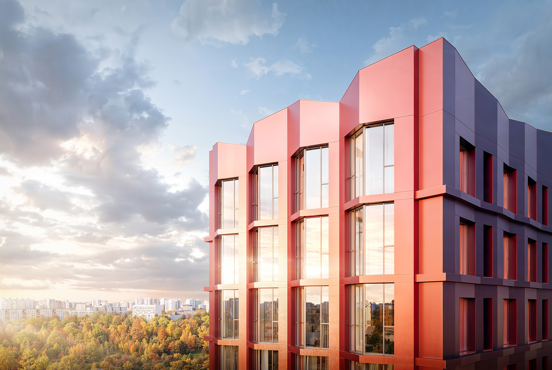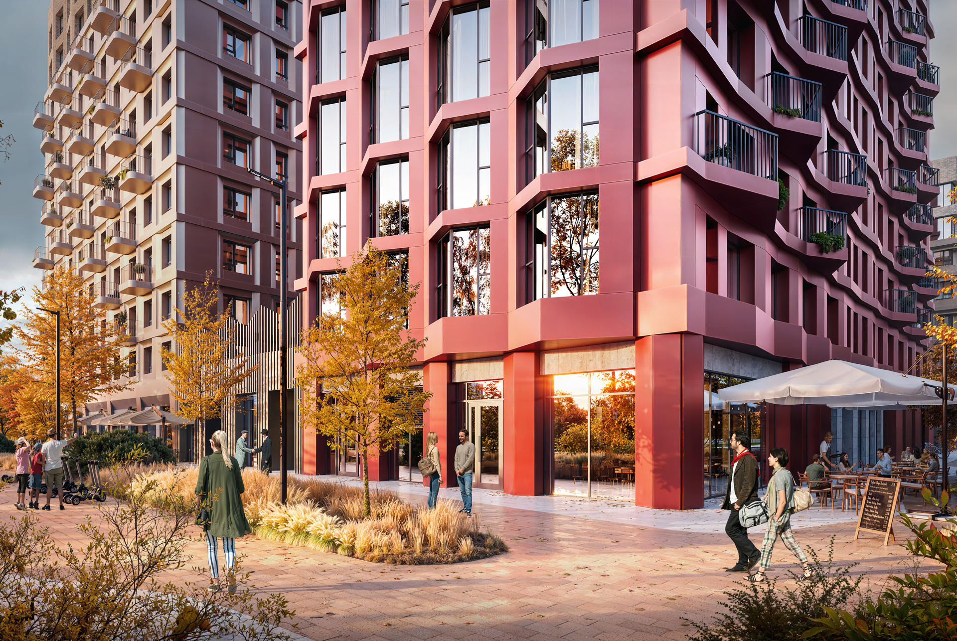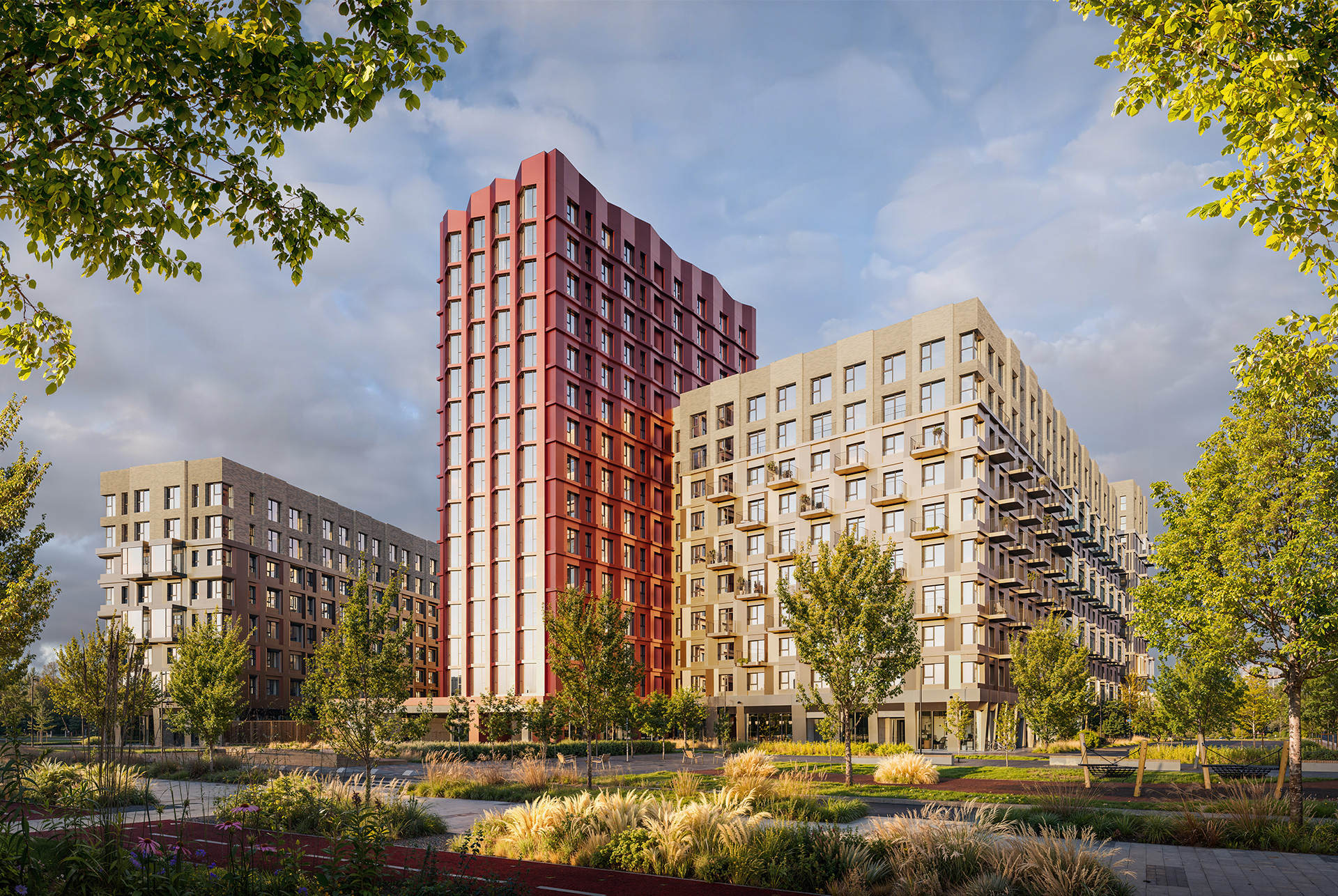 - Авторская архитектура. Концепцию проекта разработало архитектурное бюро GAFA: дома в тонах светлого камня создают обрамление для узнаваемой 15-этажной доминанты медного цвета. Также проект выделится арт-объектом на фасаде и разнообразием балконов.