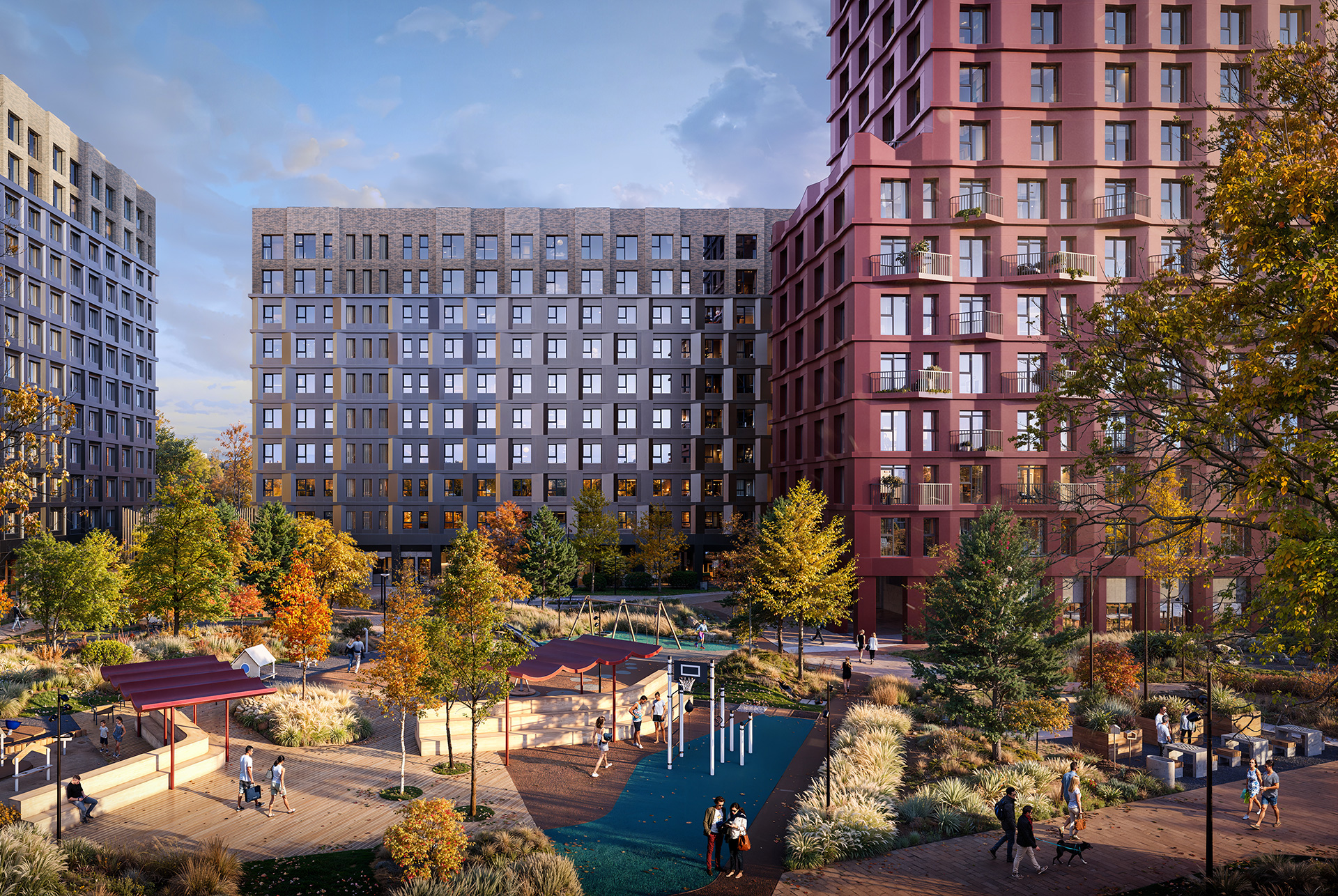 - Продуманное благоустройство. Во дворе, скрытом от посторонних глаз, появится уютный двор-парк с круглогодичным садом, урбан-фермой, детскими и спортивными зонами, столами для шахмат и пинг-понга.