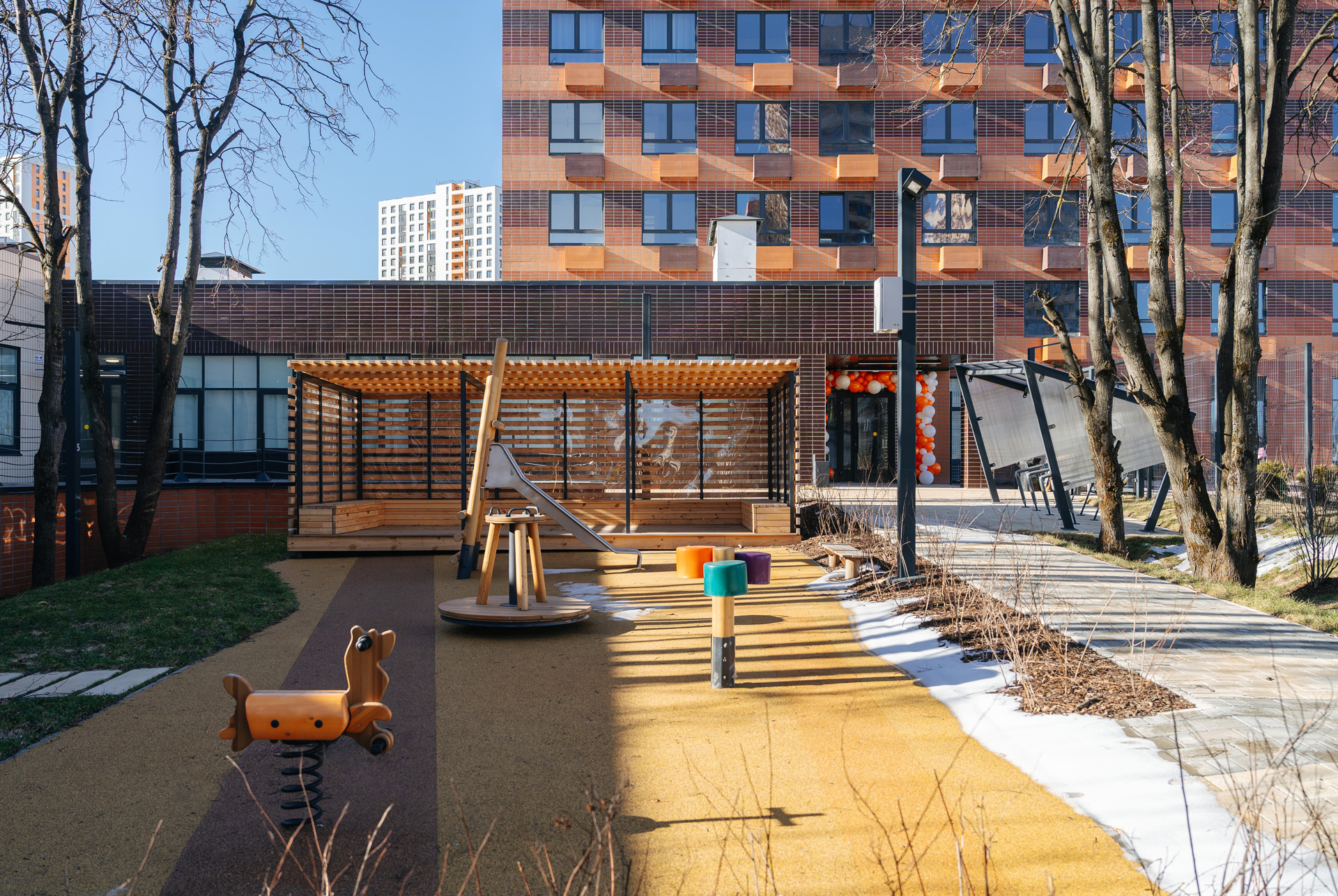 Новый детский сад гармонично вписан в архитектуру квартала. Одноэтажное здание с дополнительным подземным этажом примыкает к корпусу 1.17 и занимает часть его площади. Внутри детей ждут уютные и светлые помещения с большими окнами, которые выходят в тихий внутренний двор.
