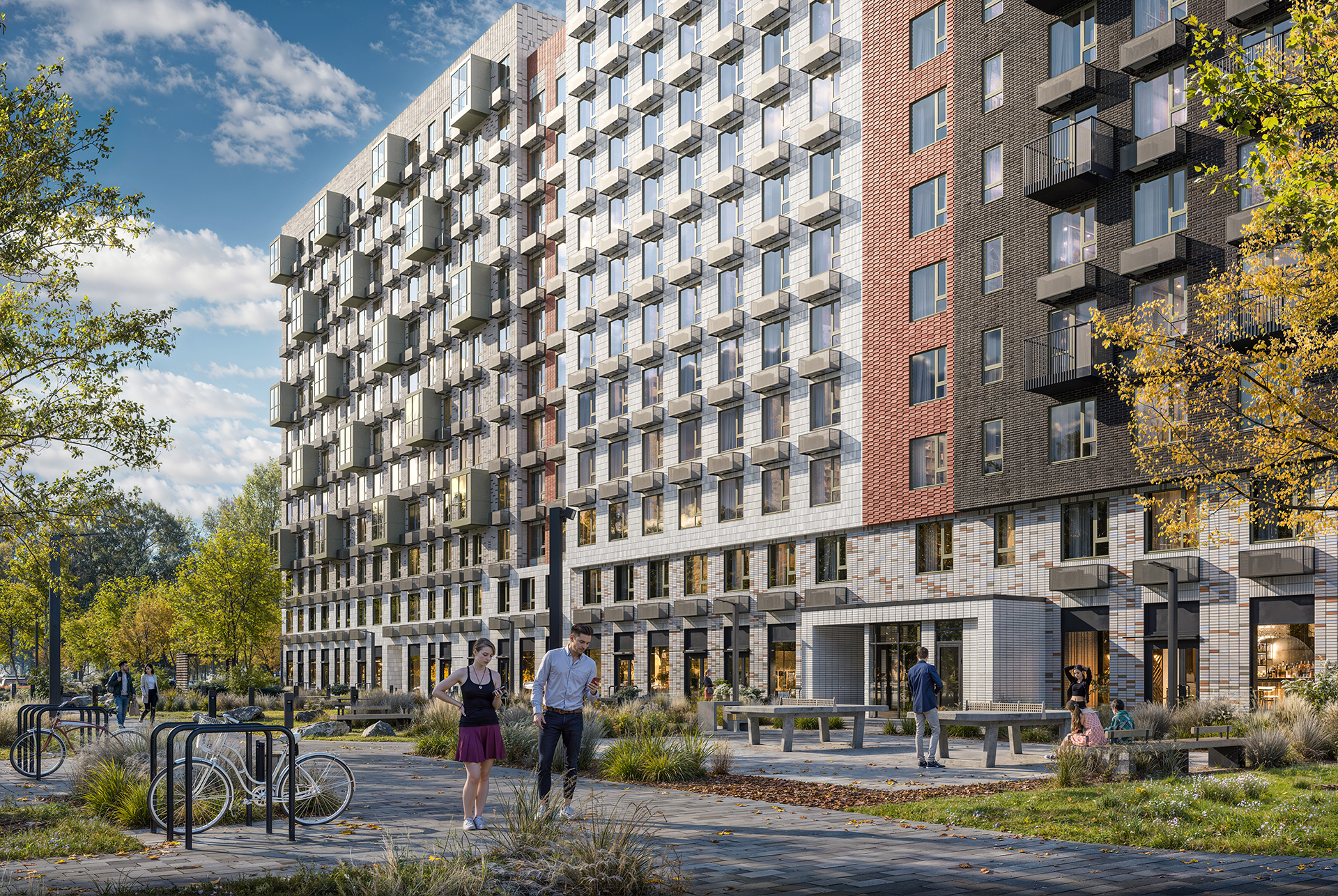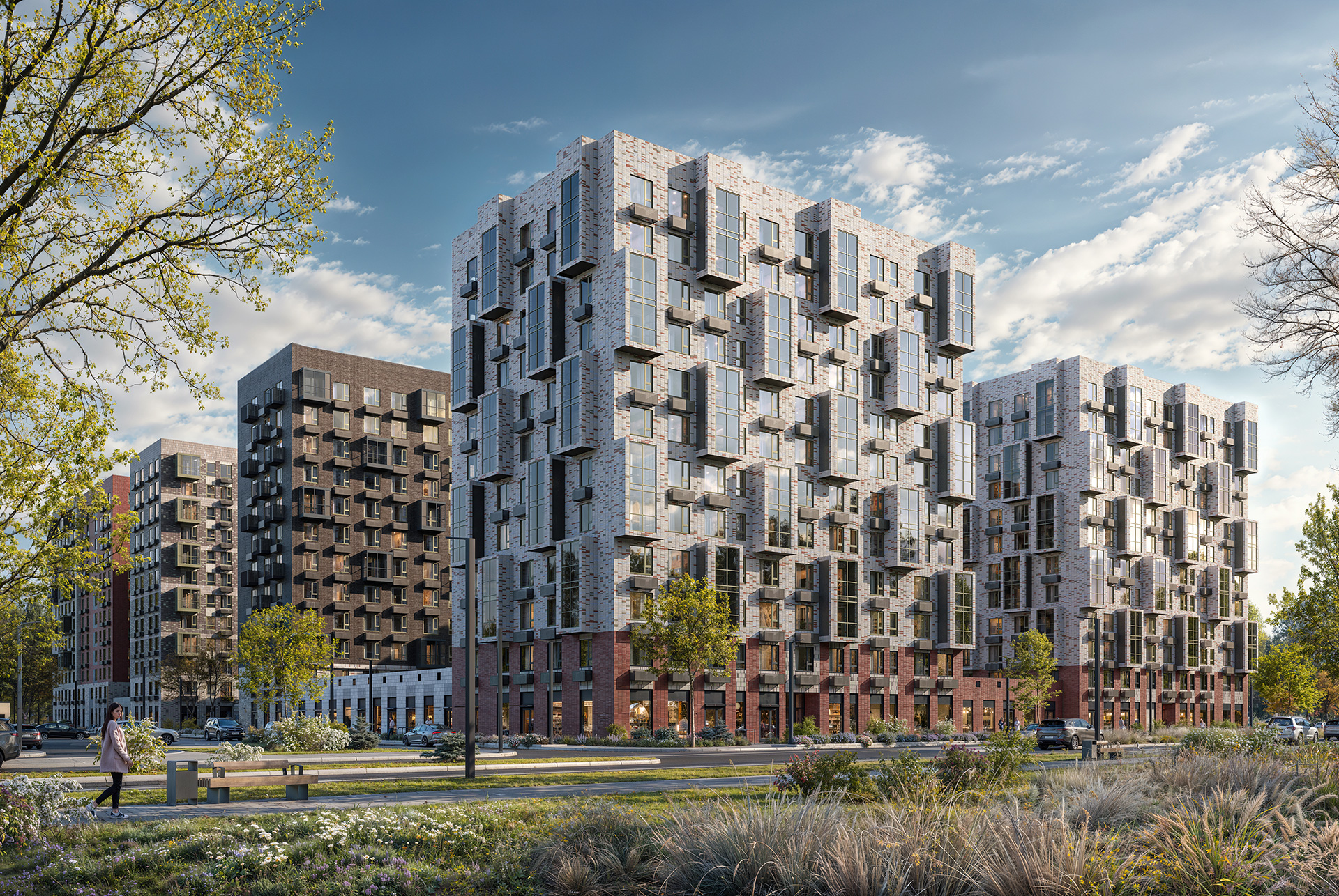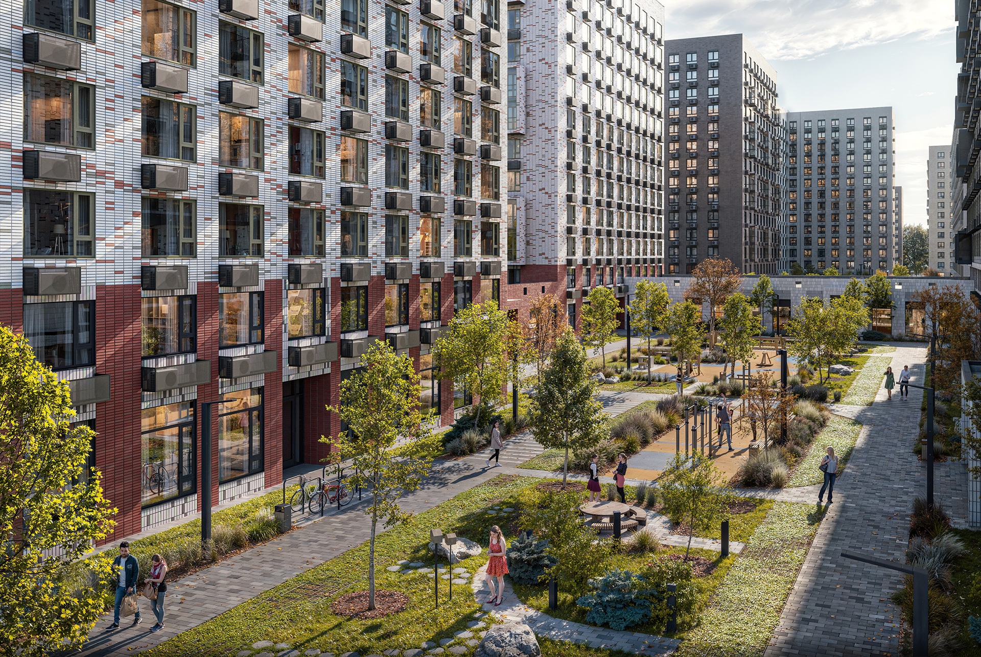 В закрытых дворах-парках будут зелёные зоны с дорожками для прогулок и местами отдыха, игровыми и спортивными площадками. А вдоль домов протянется широкий пешеходный бульвар, который станет местом прогулок, встреч и знакомств с соседями.