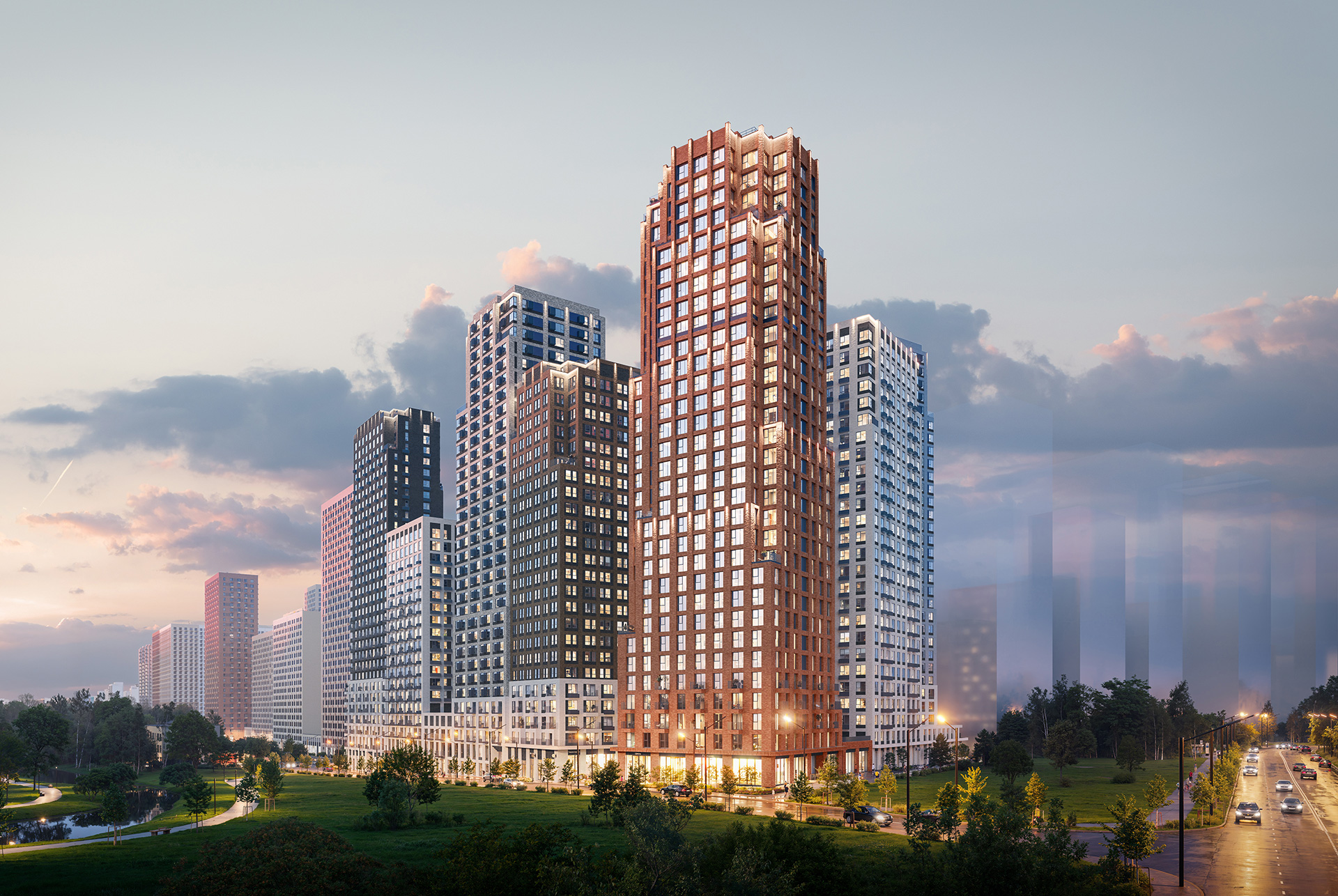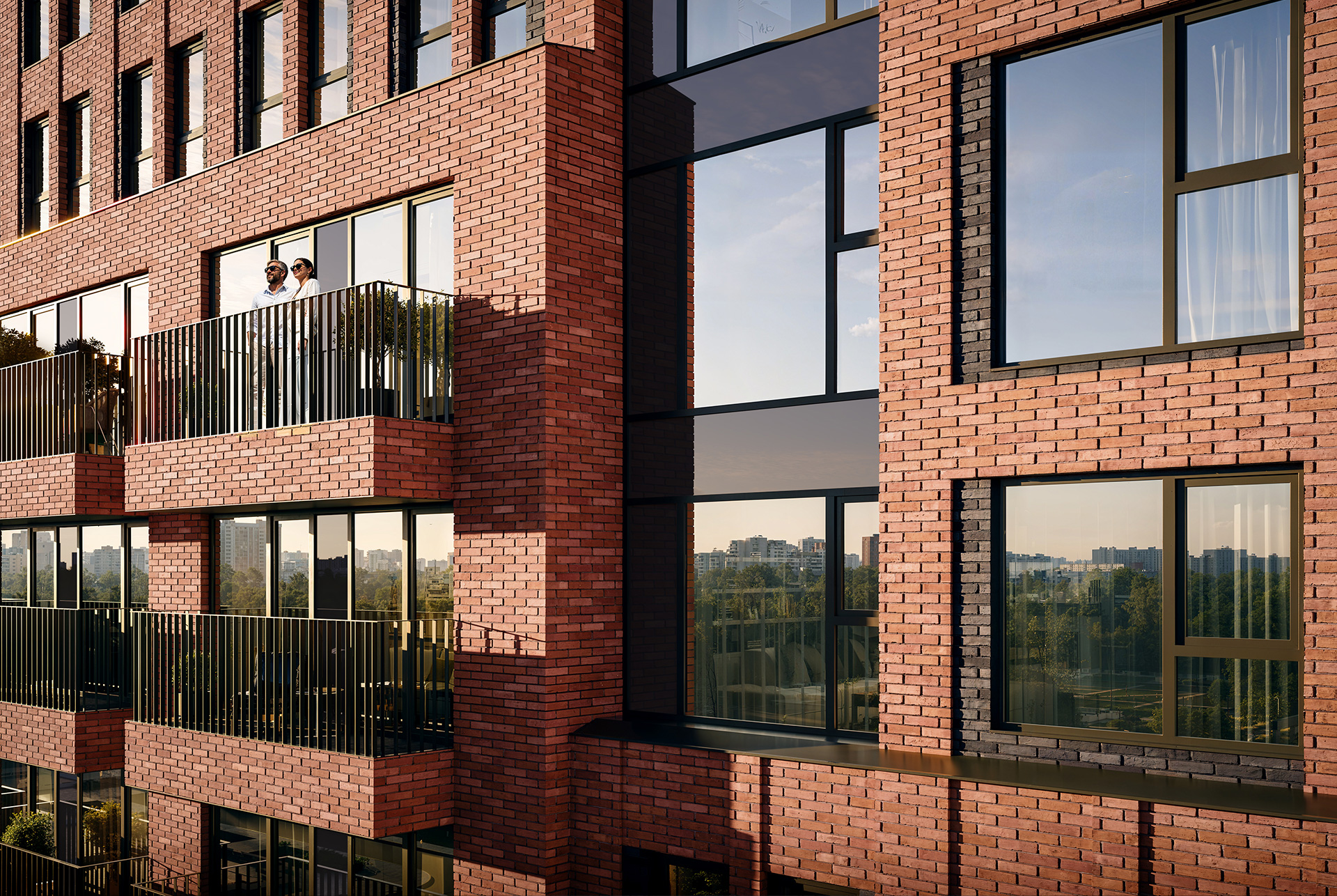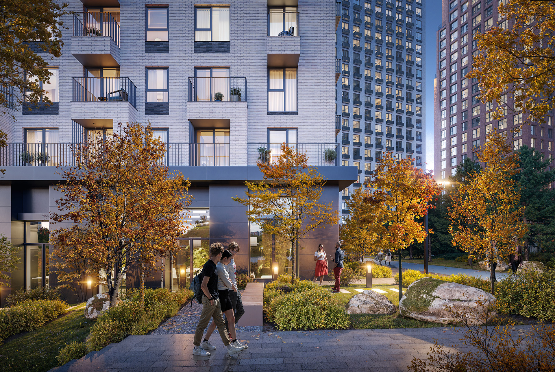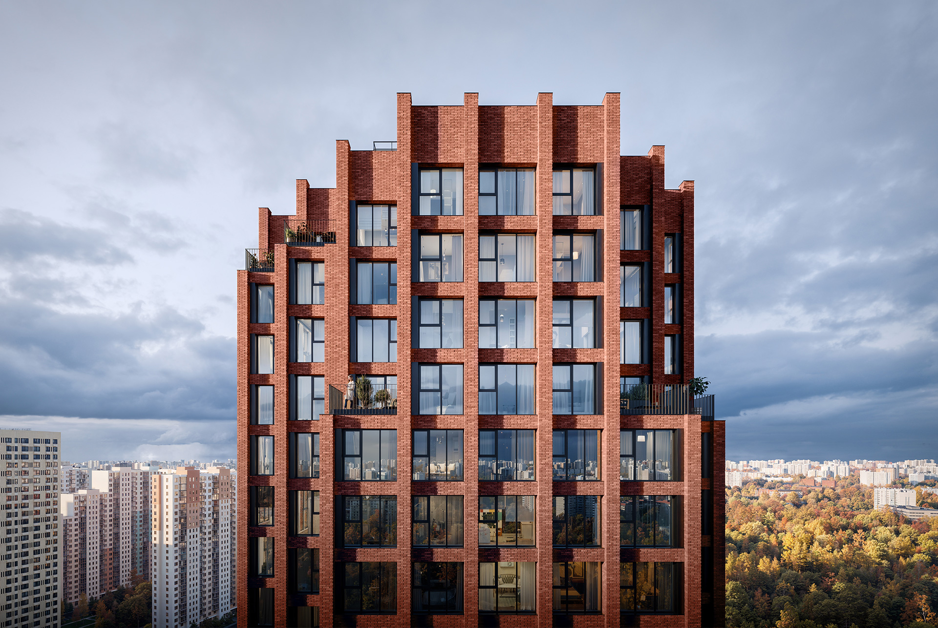 Концепция квартала сочетает эстетику и функциональность. Башня-доминанта цвета красной охры и разновысотные корпуса терракотового, белого и графитового оттенков формируют узнаваемый силуэт современного городского пространства. Просторные террасы, разнообразные балконы и окна в пол придают облику динамичность и дарят квартирам уютные места для отдыха.