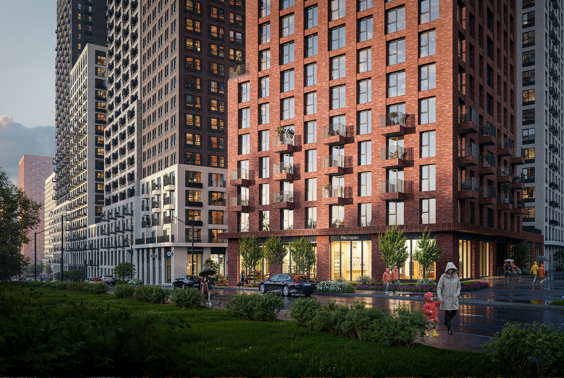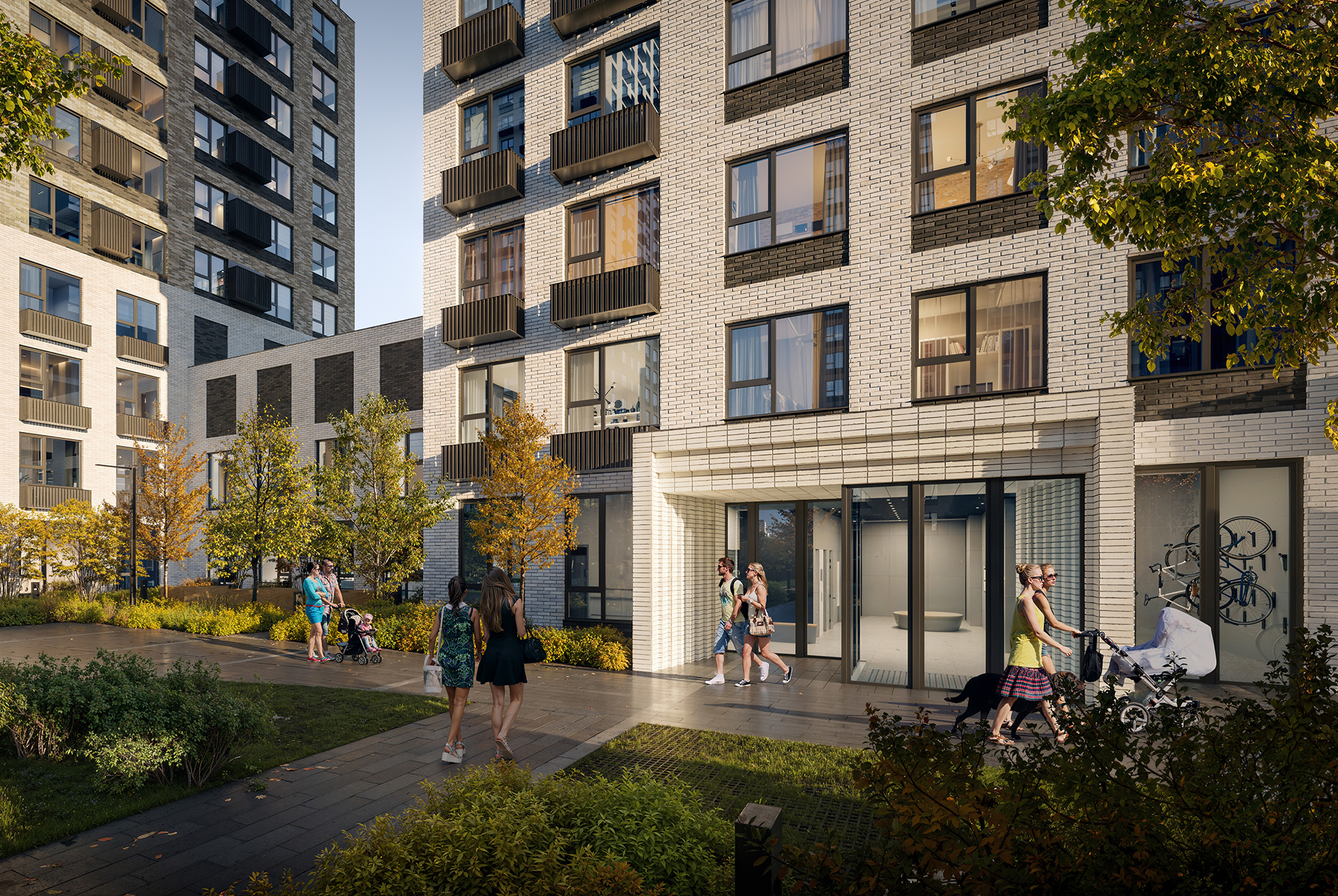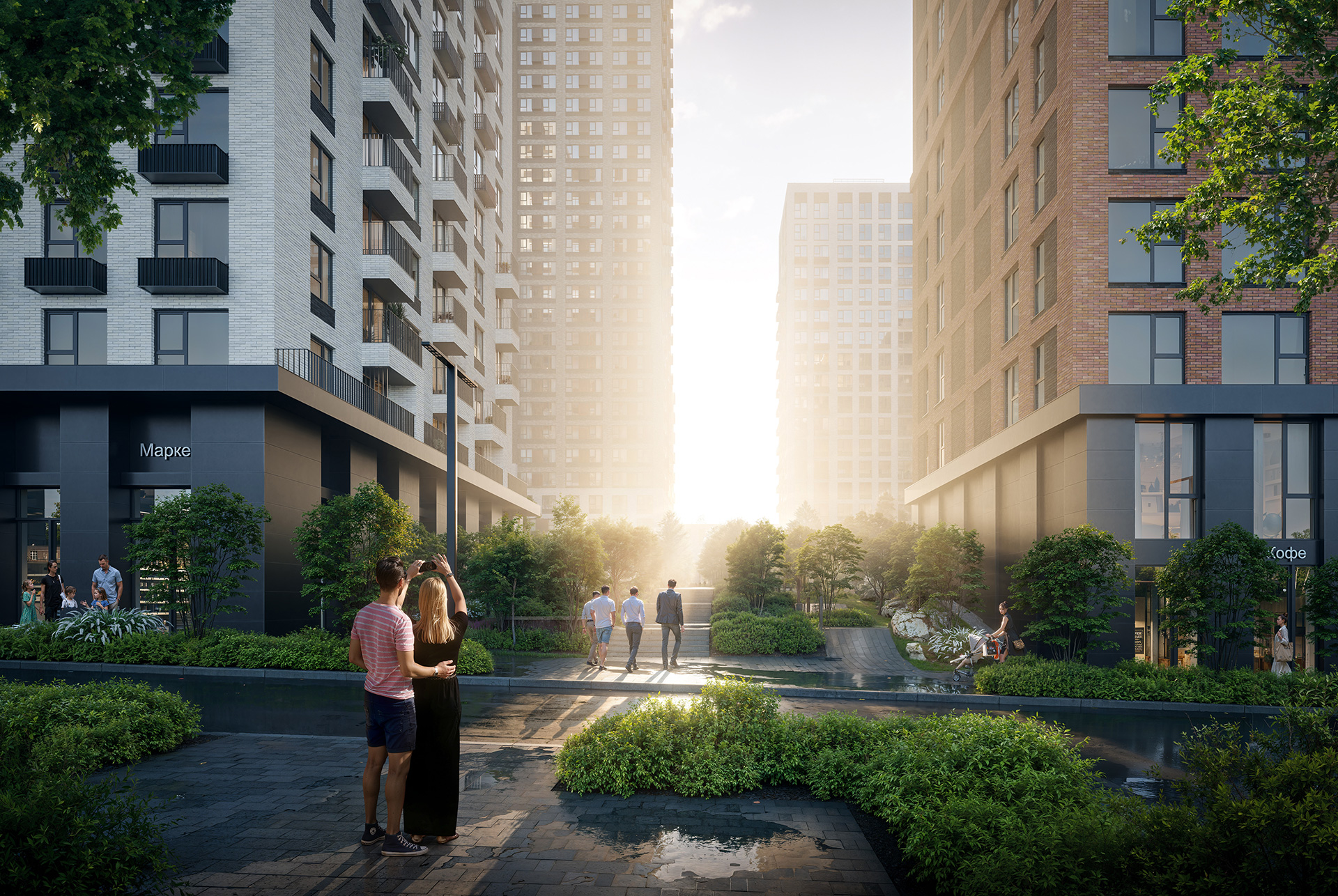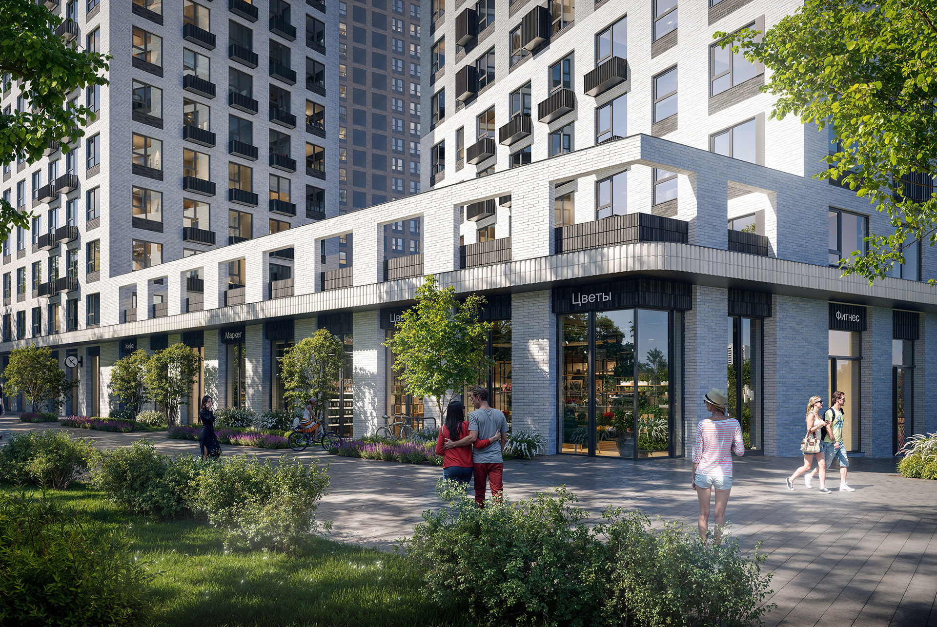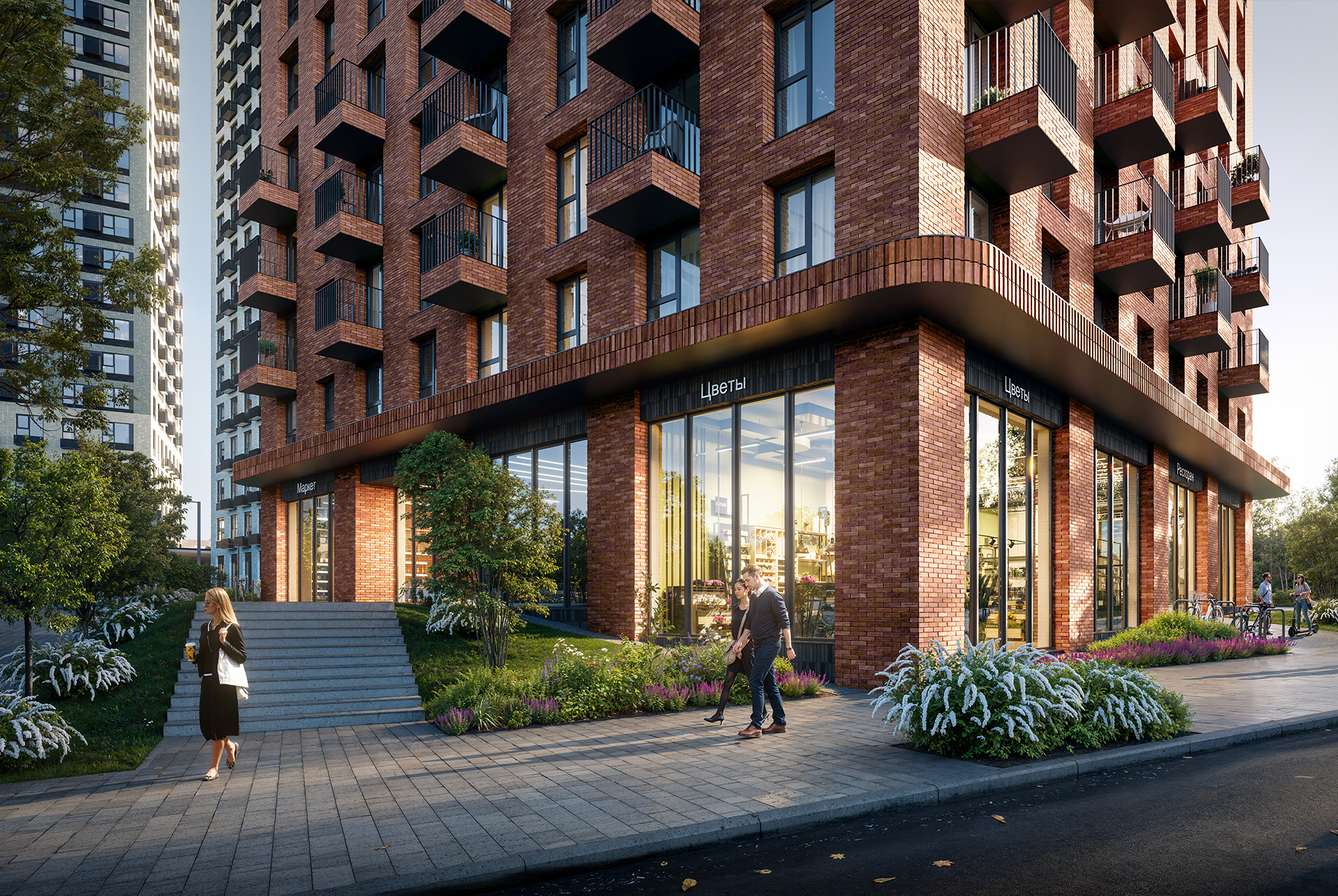 Первые этажи с панорамными окнами создают сцену для яркой городской жизни. Здесь появятся пространства для прогулок, летние террасы, рестораны и коммерческие помещения.