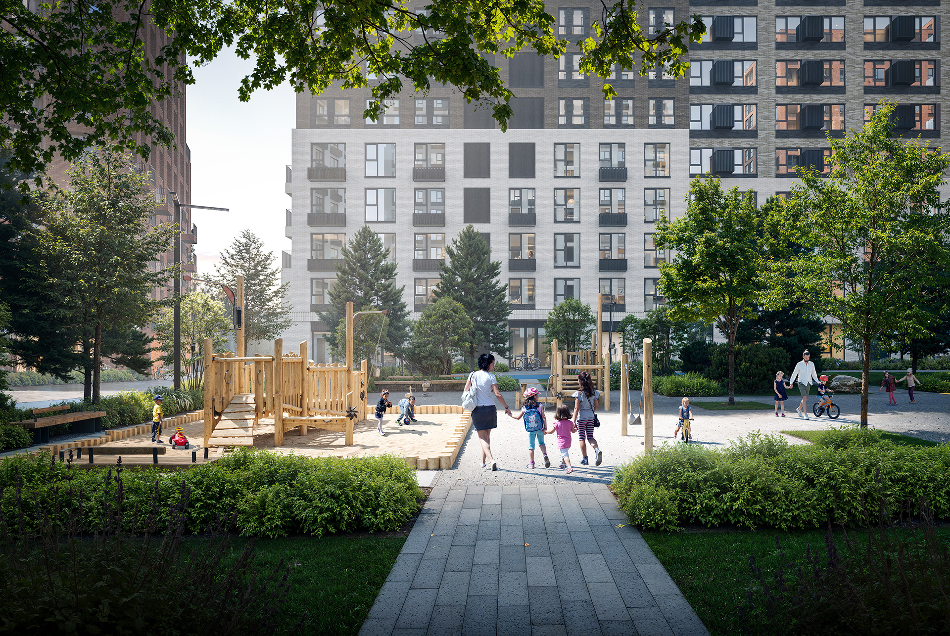 Квартал строится в экологически чистом районе, окружён живописным лесом и реками. Здесь будет два детских сада и школа. Вдоль домов протянется торговая аллея с кафе, магазинами и полезными сервисами. Во дворах-парках появятся игровые и спортивные площадки, зоны отдыха и зелёные лужайки, где можно устроить пикник.