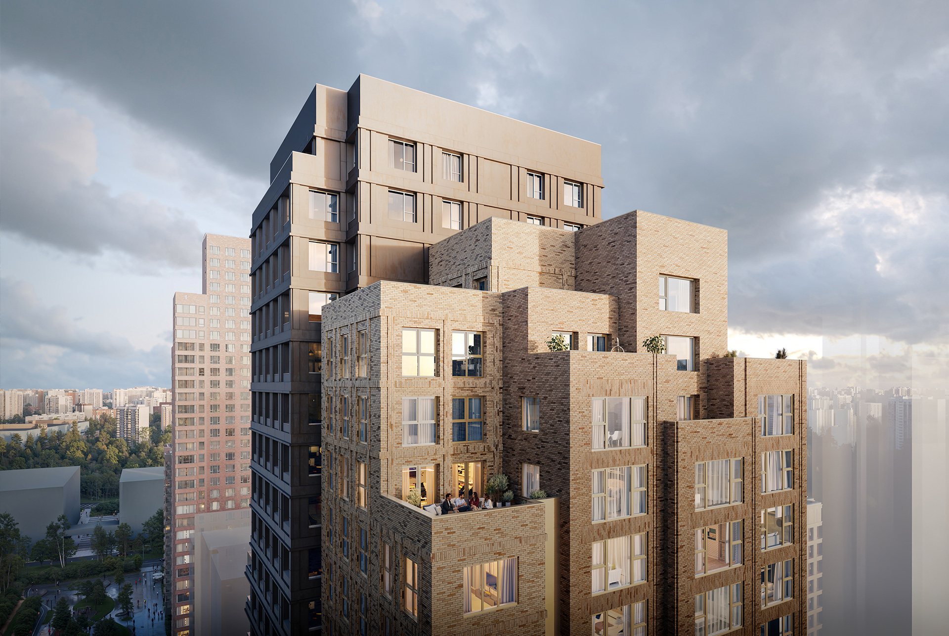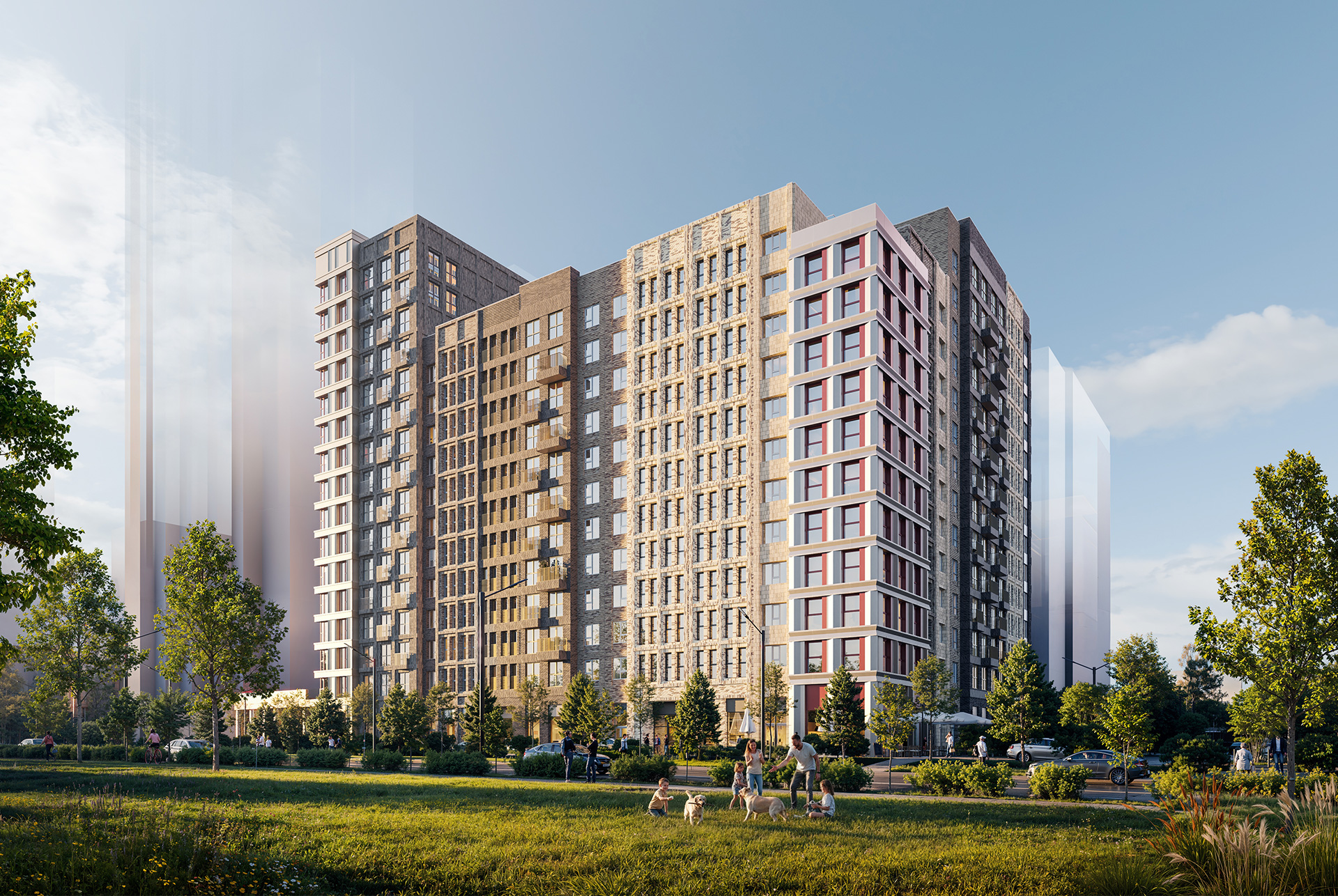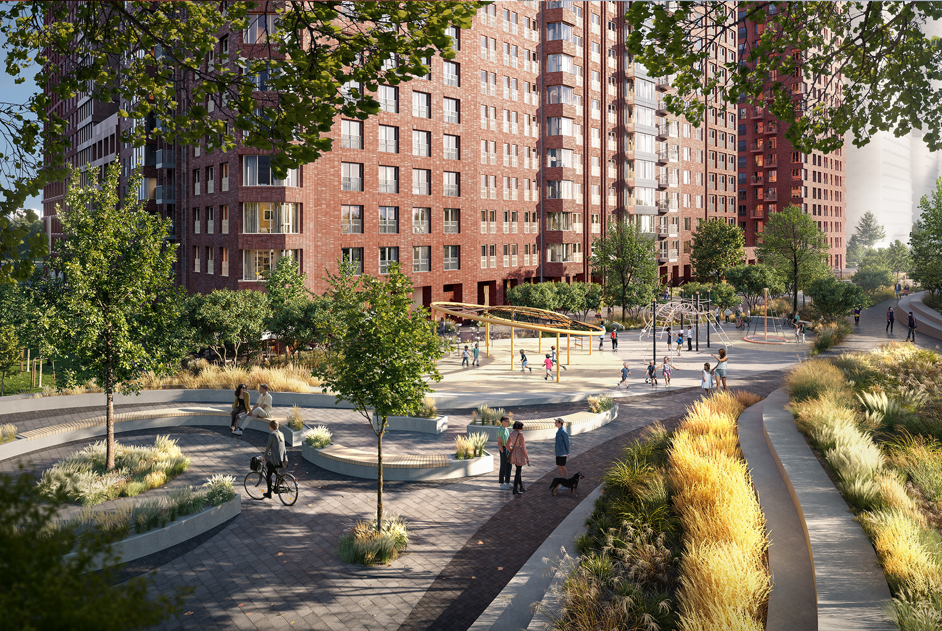 В проекте будет собственная социальная инфраструктура: школа, два детских сада и поликлиника. Во дворах появятся зелёные парки с детскими и спортивными площадками.