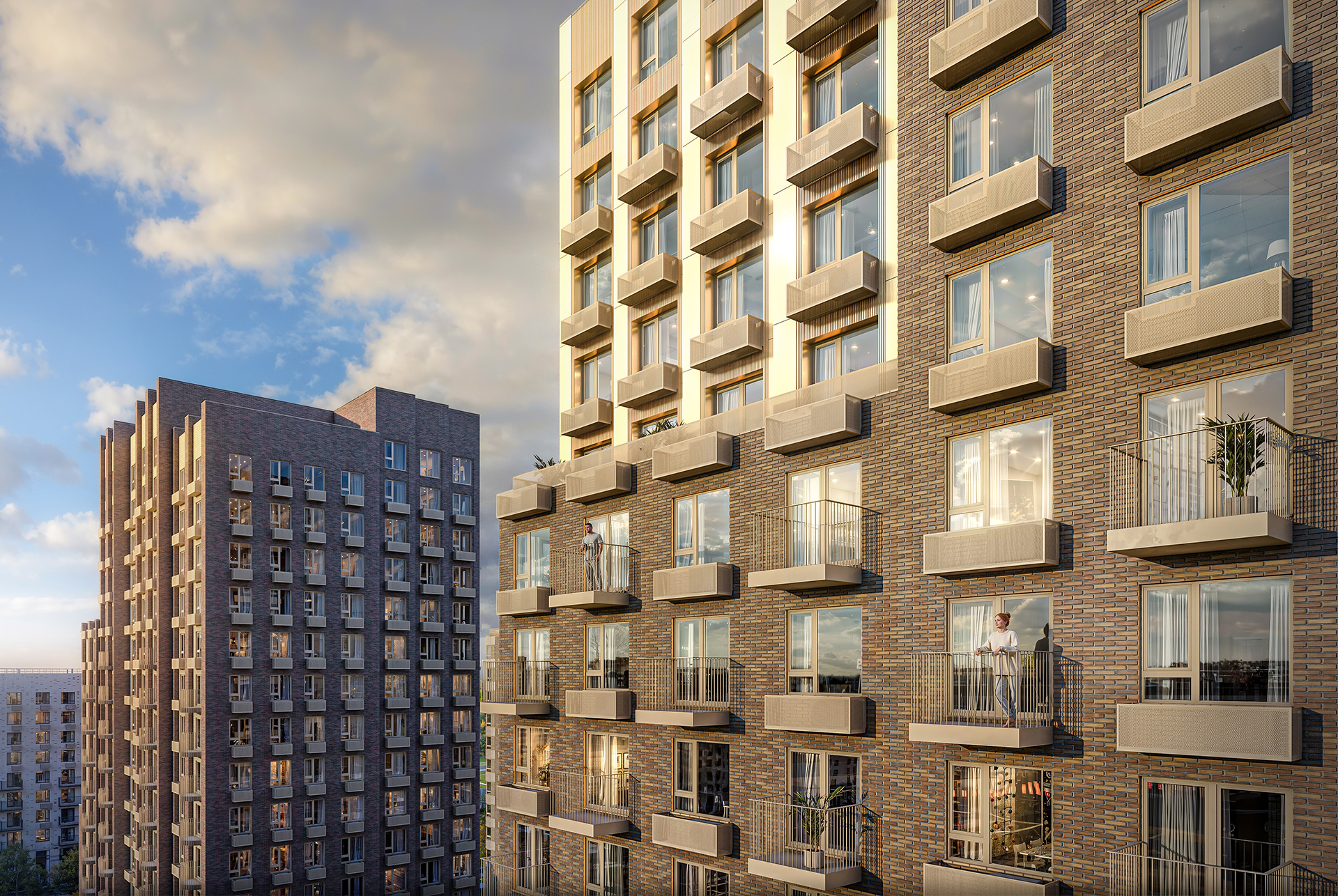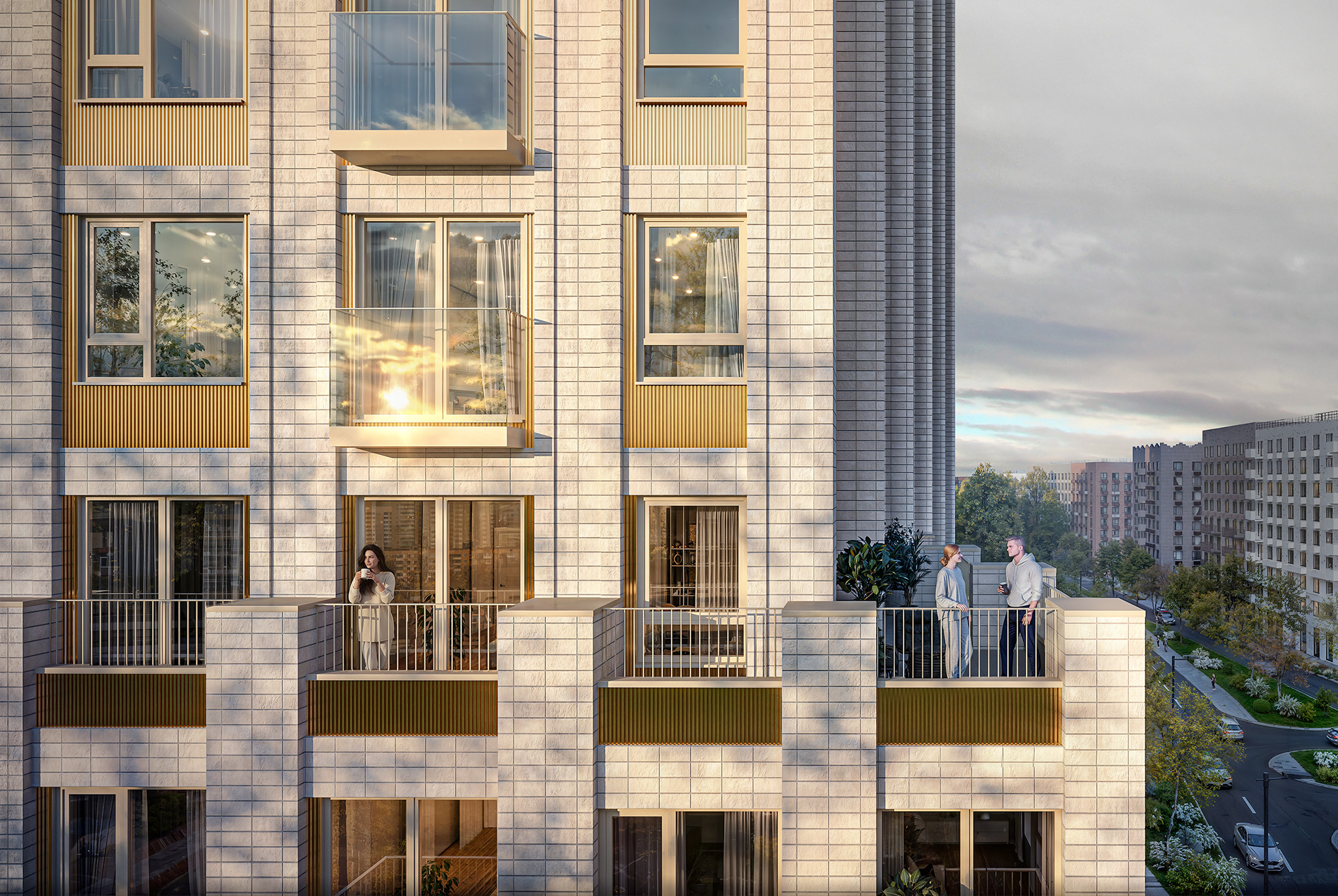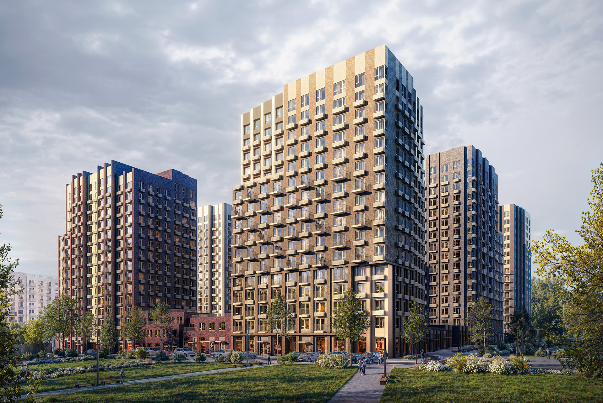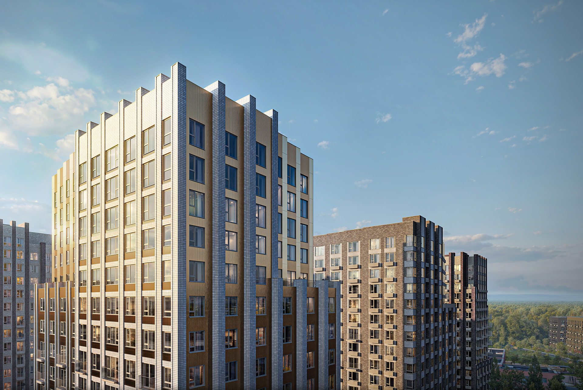 Корпус 2.1 гармонично дополнит уже построенные в проекте дома. Шесть башен средней этажности с архитектурной подсветкой оформлены в тёплой цветовой гамме с золотистыми акцентами. Самая заметная центральная башня выделяется благодаря светлым фасадам и выразительной пластике.
