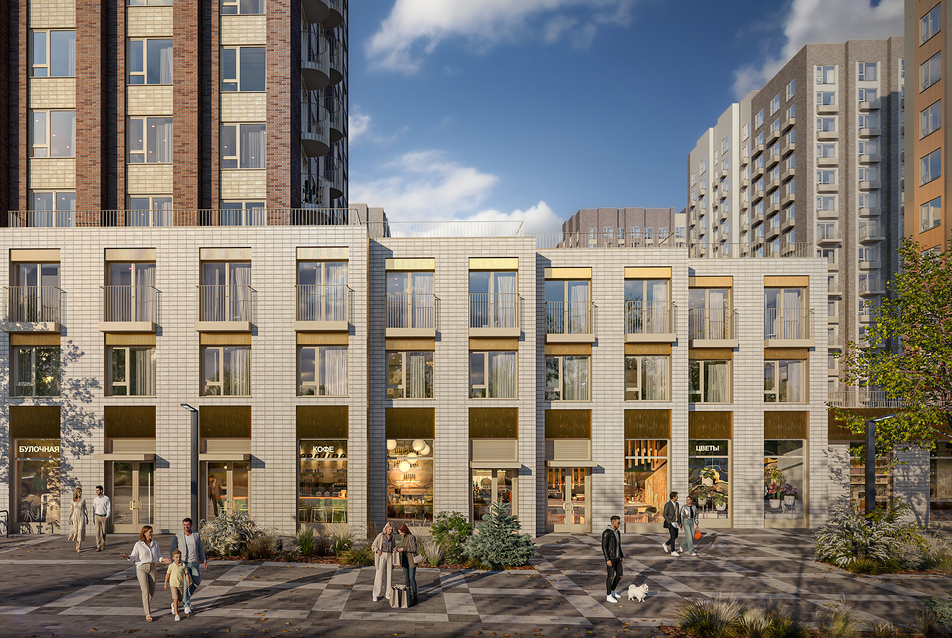 Во дворе без машин будут оборудованы детские и спортивные площадки. На первых этажах расположатся кафе, магазины, пункты выдачи заказов и другие полезные сервисы.