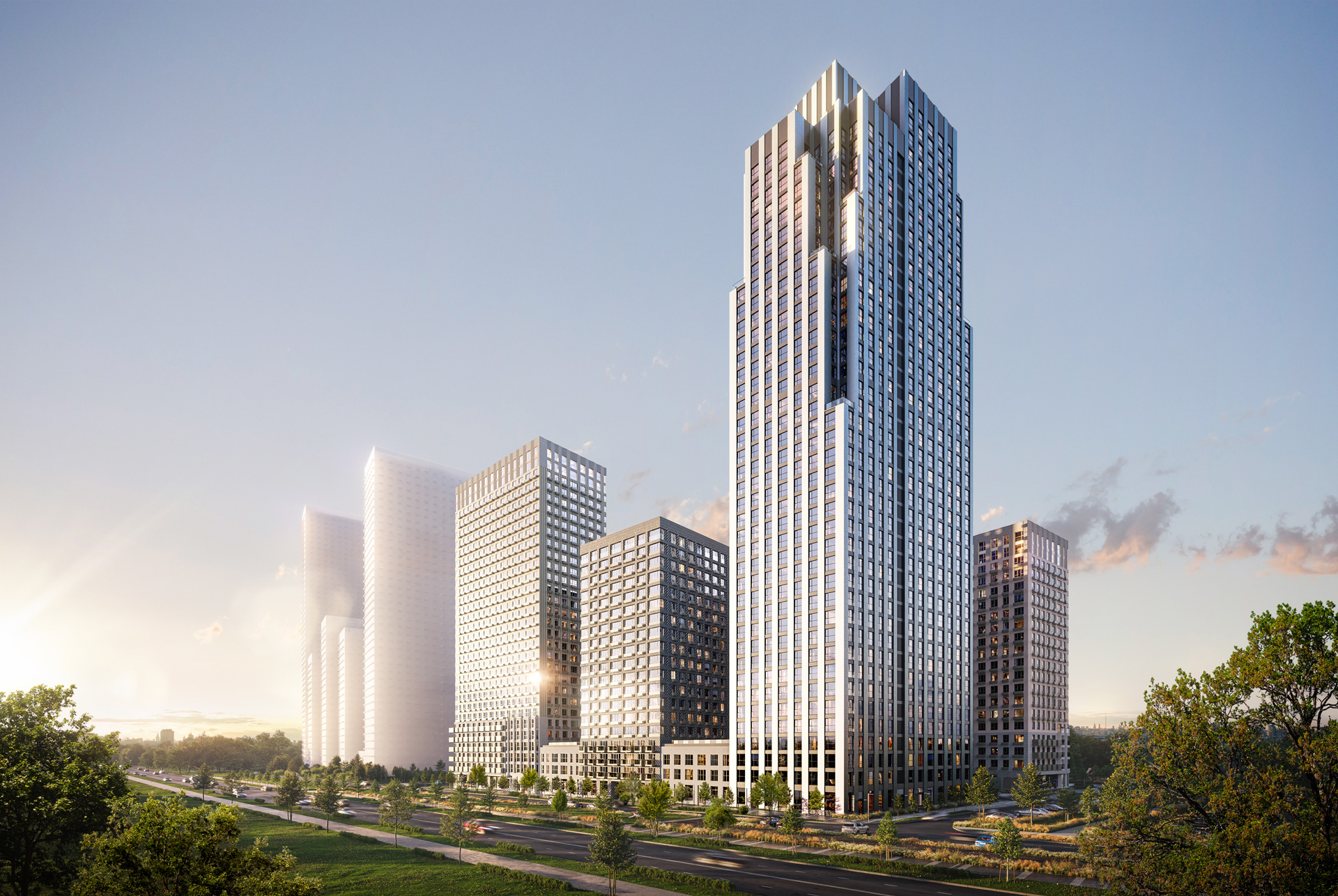 Скульптурная башня высотой 43 этажа будет главным акцентом разновысотного проекта и станет заметной частью городской перспективы. Над архитектурным обликом здания работало бюро Apex.