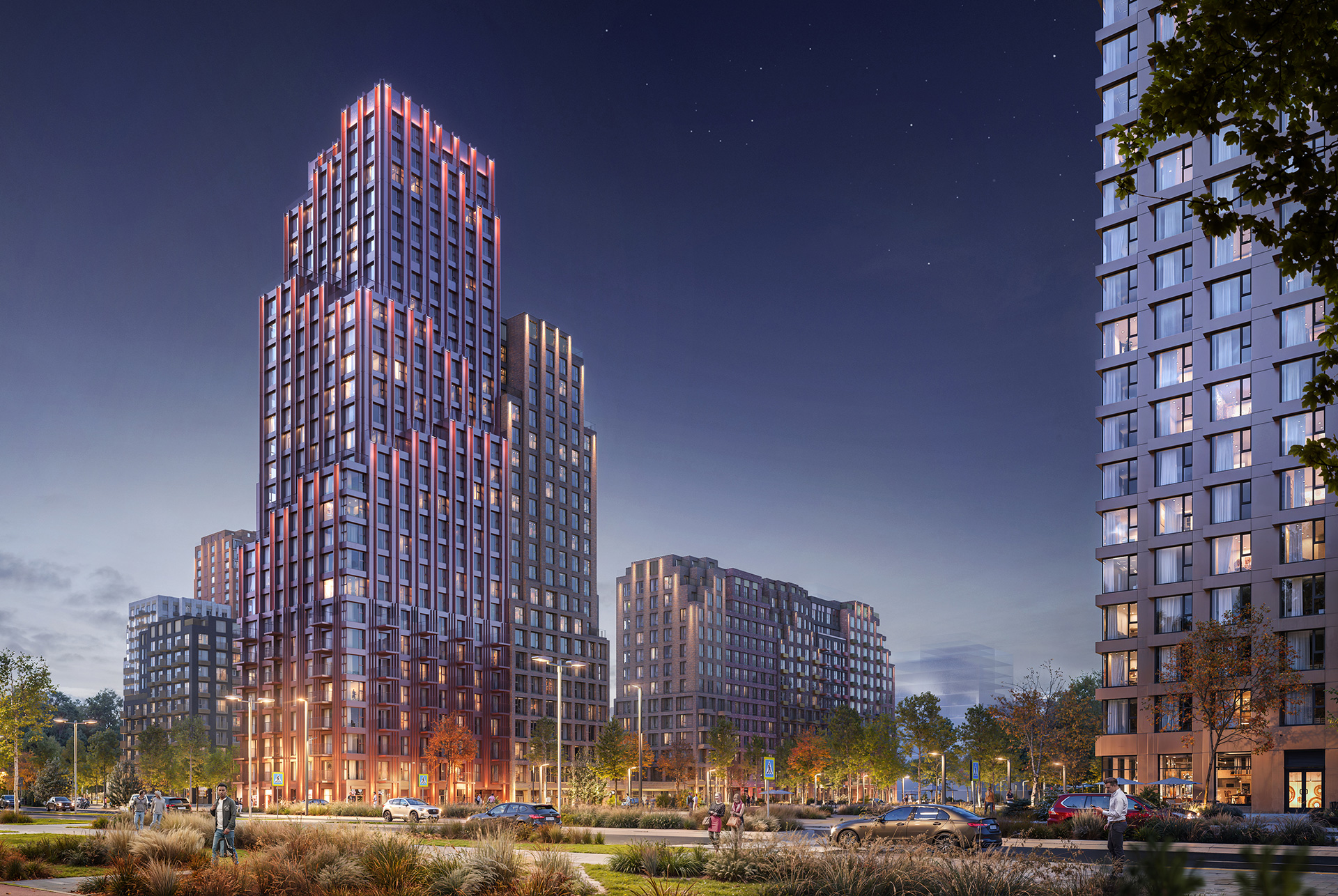 Дворы-парки с местами для отдыха, игровыми и спортивными площадками будут закрыты от машин. А на первых этажах домов появится торговая аллея с магазинами, кафе и полезными сервисами.
