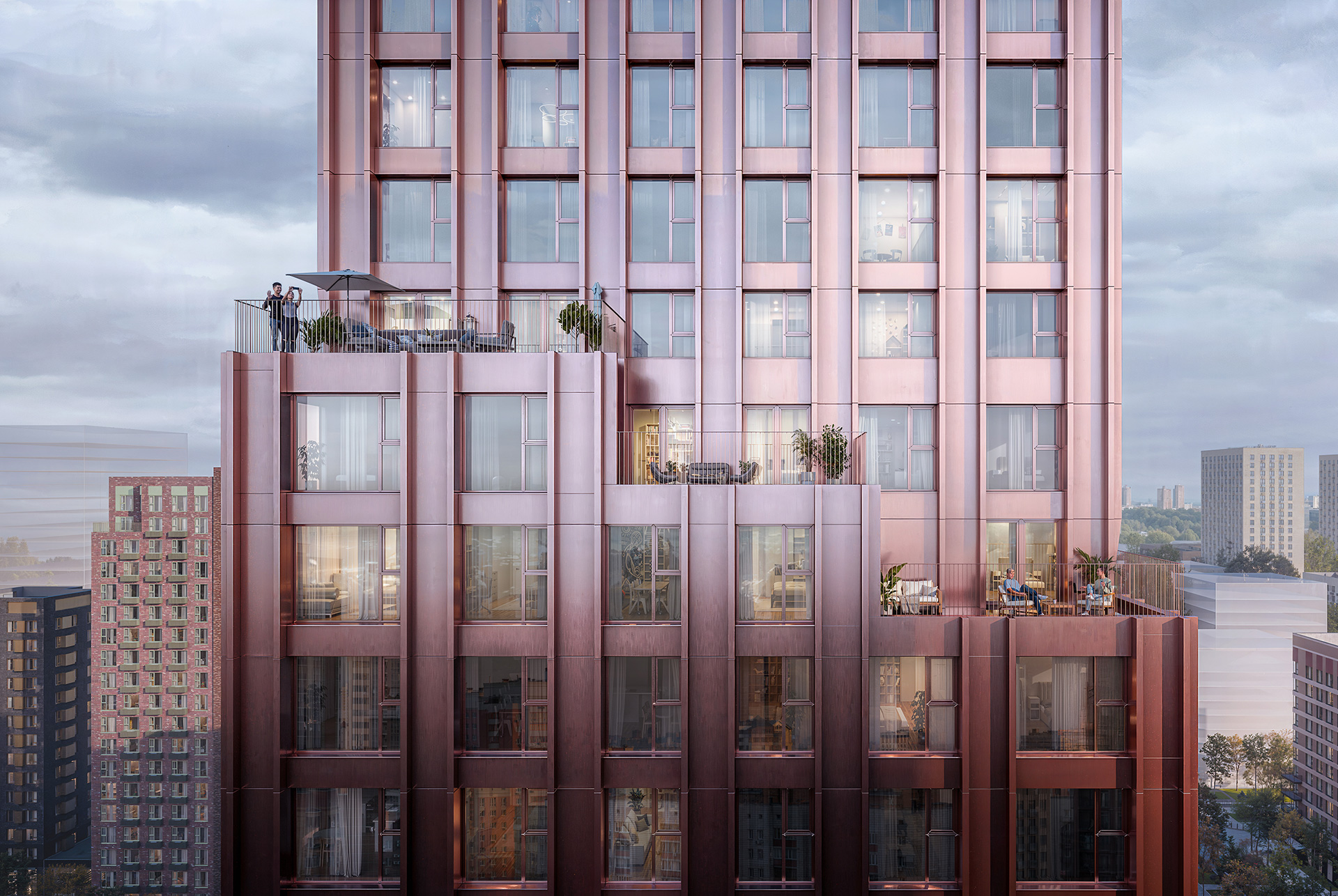 В «Зелёном парке» в Зеленограде начались продажи в новом корпусе 5.4 — архитектурной доминанте проекта. Скульптурный силуэт 28-этажного здания со ступенчатыми фасадами медного цвета разработало архитектурное бюро Slava+. Глубокие оконные проёмы и декоративные ламели, расположенные в особом ритме, придают корпусу динамичность и уникальность.