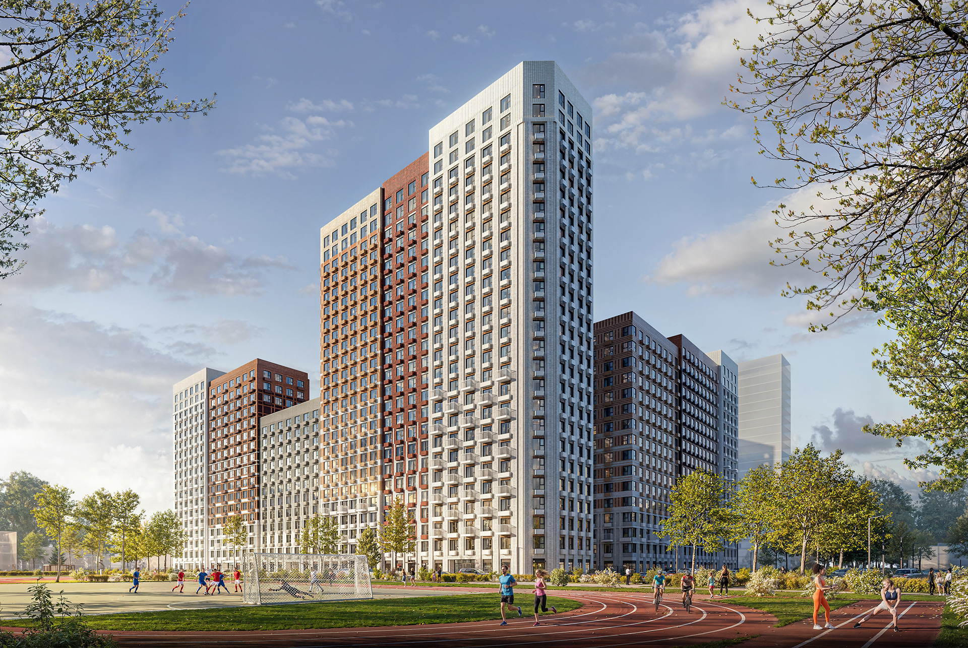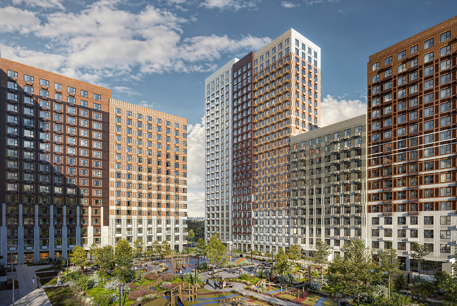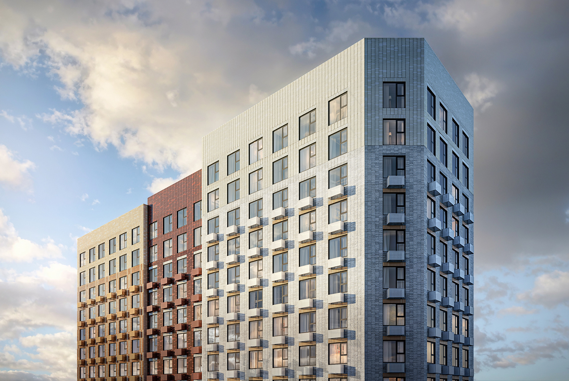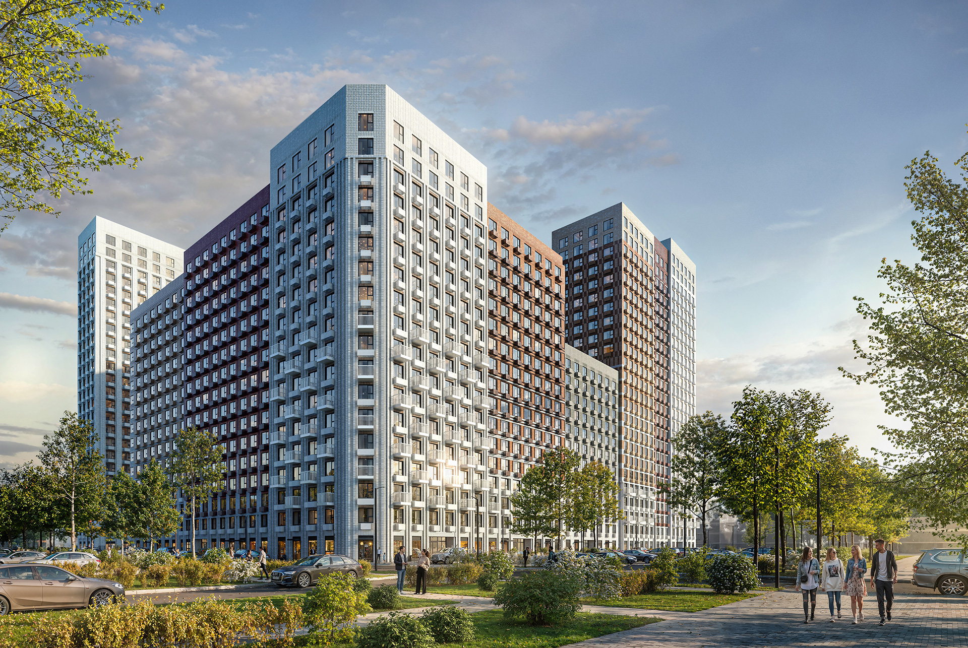 У корпусов переменная этажность — от 12 до 25 этажей. Разница в высоте создаёт визуальное разнообразие, задаёт архитектурный ритм и помогает солнечному свету свободнее попадать в квартиры и дворы.