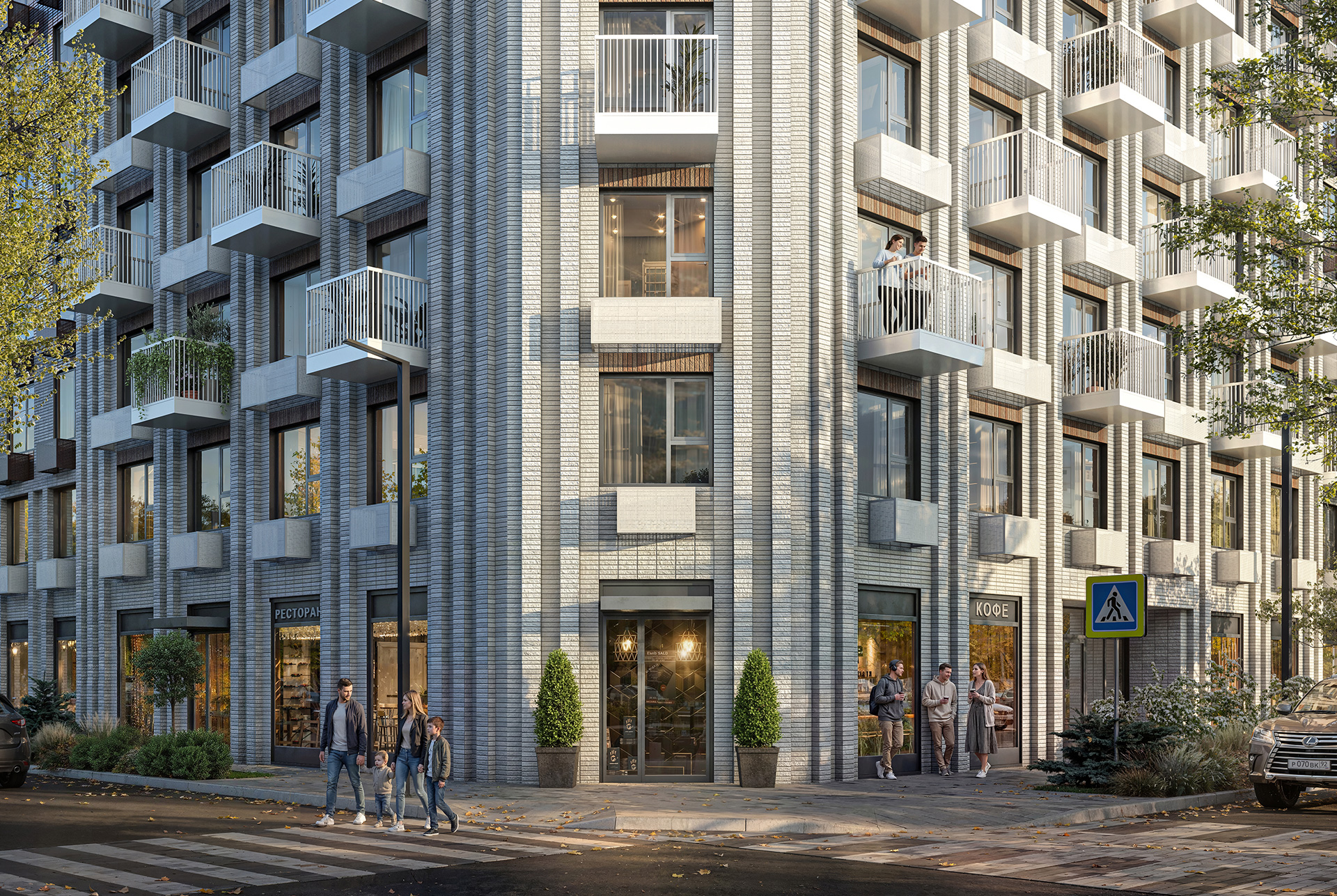 Фасады корпусов оформлены в натуральных природных оттенках: сером, терракотовом, зелёном и молочно-белом цвете. Их архитектуру подчёркивают уникальные элементы: окна в пол, открытые и закрытые балконы, открытые лоджии.