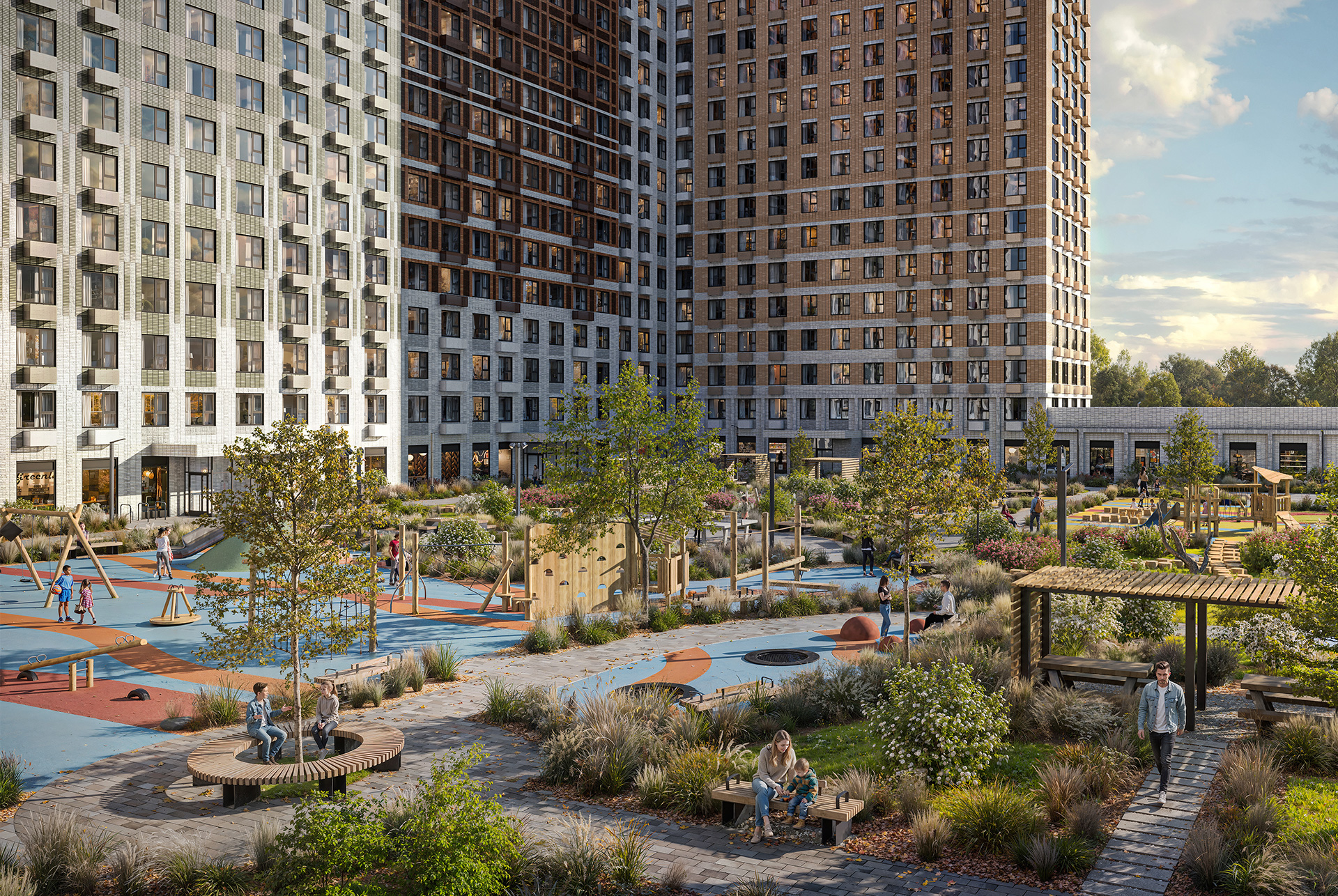 В проекте будут построены 22 корпуса, две школы, пять детских садов и поликлиника. В сердце квартала уже создан пешеходный бульвар с пространствами для спорта, отдыха и прогулок. Для родителей с детьми на пешеходном бульваре расположен PlayHub «Ферма» — масштабное игровое пространство с домом-мельницей и искусственным ручьём. Для самых юных жителей есть песочница с навесом и цыплятами-качалками.