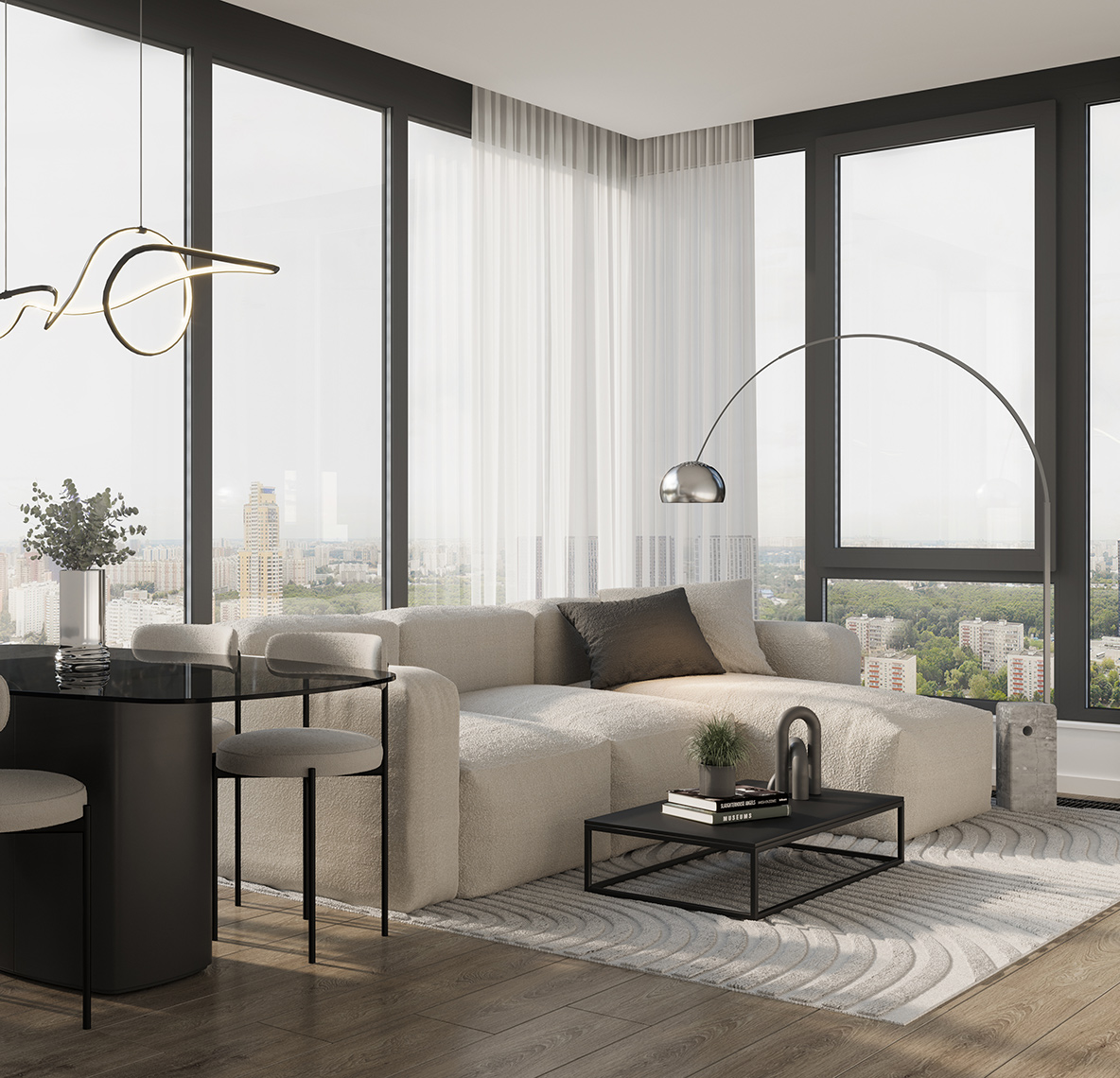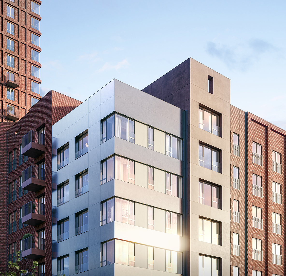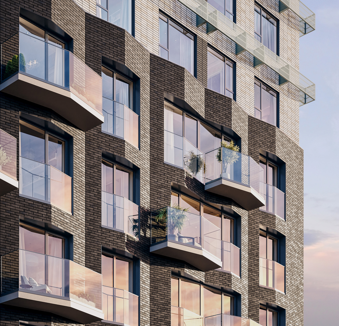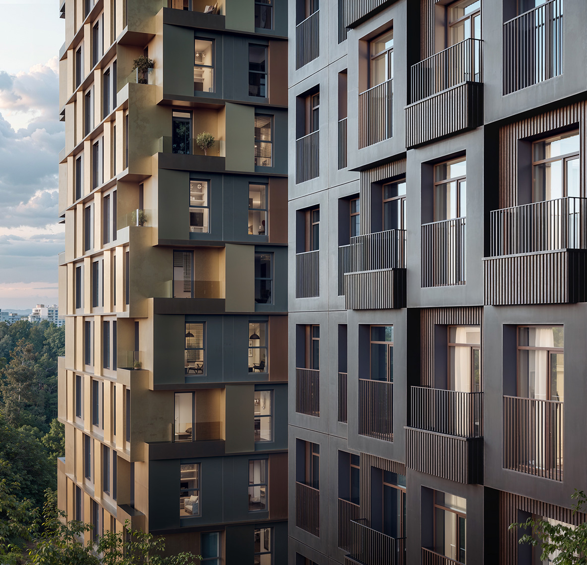 Сложная пластика силуэтов и уникальность зданий достигаются за счёт различных объёмных элементов: эркеров, металлических кассет, необычных балконов и отделочных материалов с выразительной фактурой. За счёт этого дома выглядят эффектно, а в квартирах появляются необычные и функциональные планировочные решения.